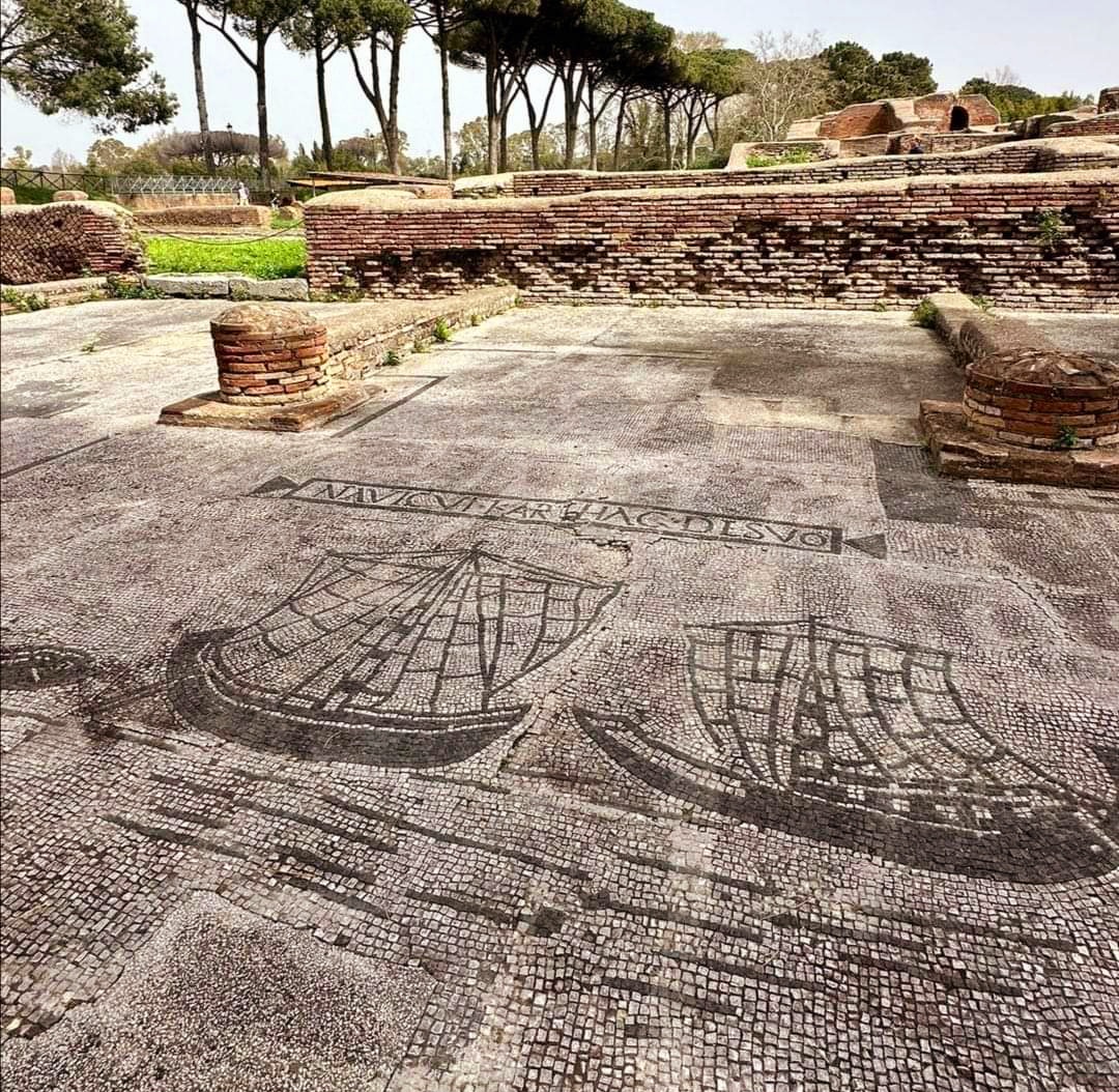 로마 제국 전역의 상인들은 오스티아 안티카 Ostia Antica에 "사무실"이 있었다. 그런 사무실 간판이 이런 모자이크였다.