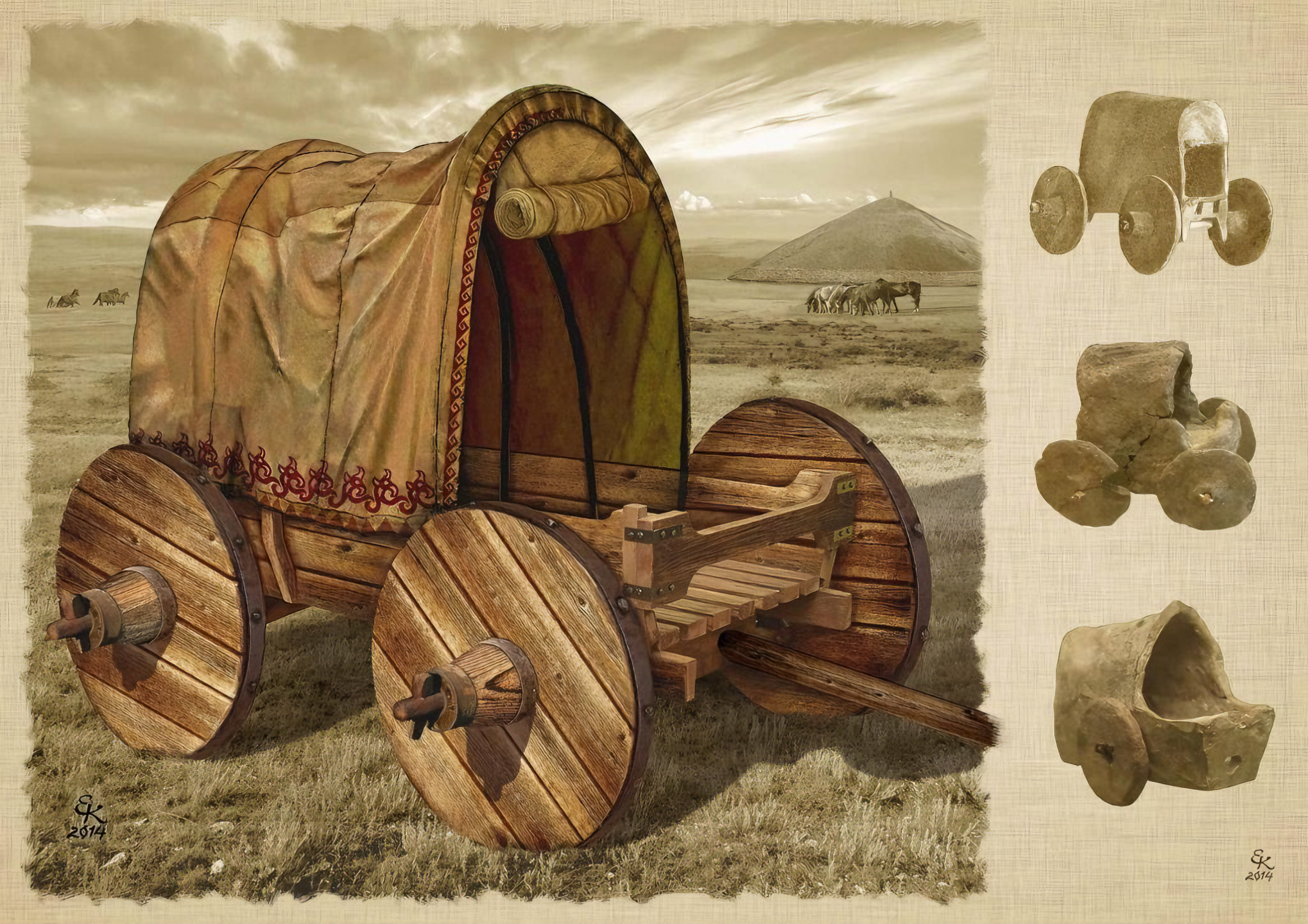아르메니아 세반 호수 Lake Sevan 인근 차셴 Lchashen 마을이란 데서 발굴된 4000년 된 잘 보존된 마차 여러 대 wagons 중 하나라 한다. 참나무 oak 로 만든 왜건은 세계에서 가장 오래된 것으로 알려진 같