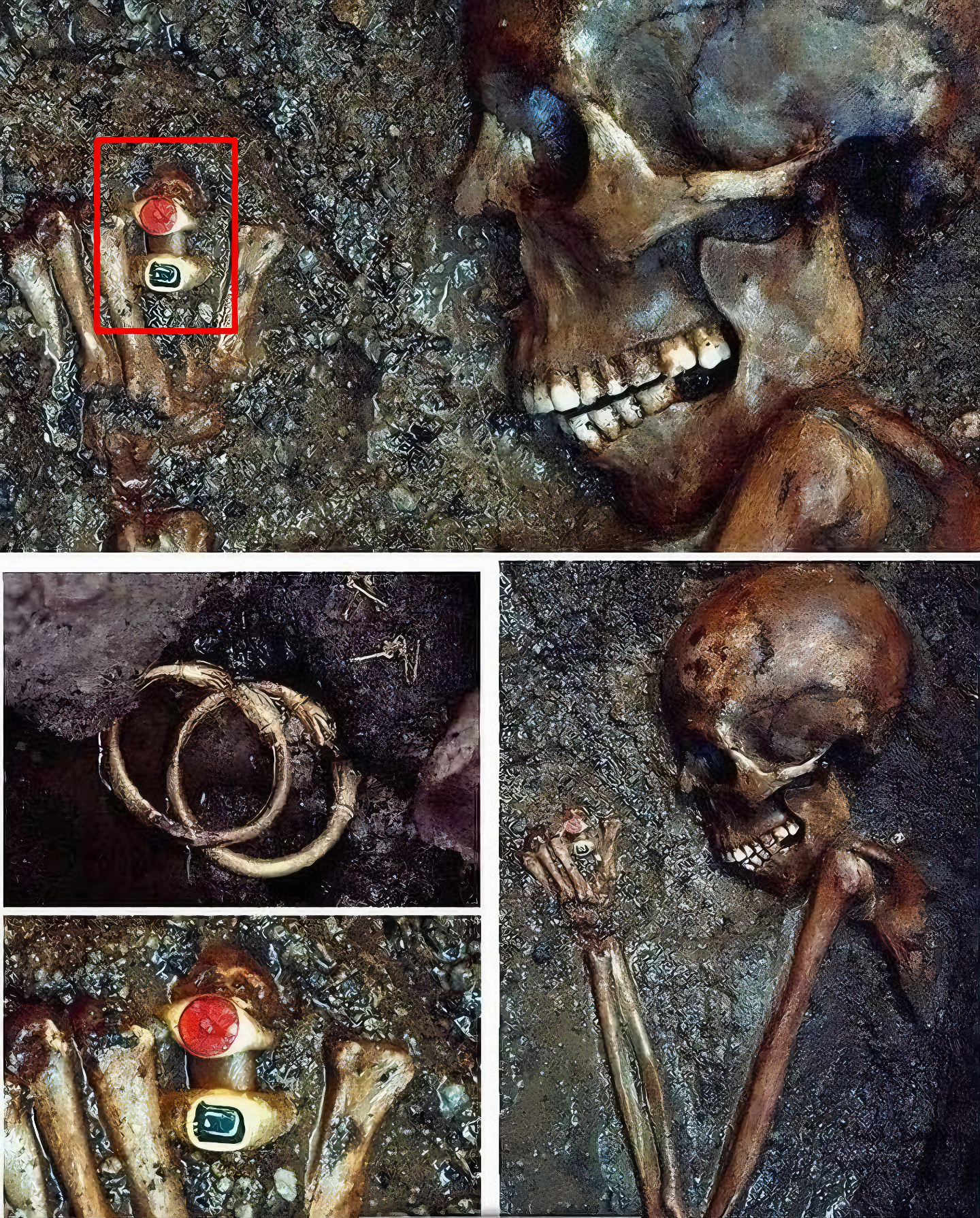 그녀의 왼손을 장식한 귀중한 보석, 한 세트는 에메랄드로, 다른 세트는 루비로 장식된 한 쌍의 정교한 금반지는 그녀의 사회적 지위와 그녀가 소유한 물질적 부를 말해준다.