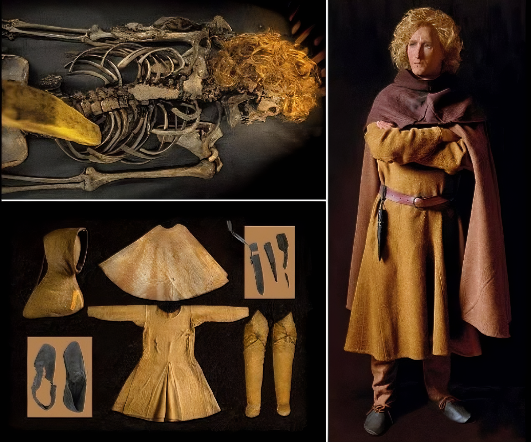 왼쪽 사진은 시신과 함께 발견된 원래 옷을 보여주고, 오른쪽 사진은 그가 살아 있었을 당시 모습을 복원한 것이다.