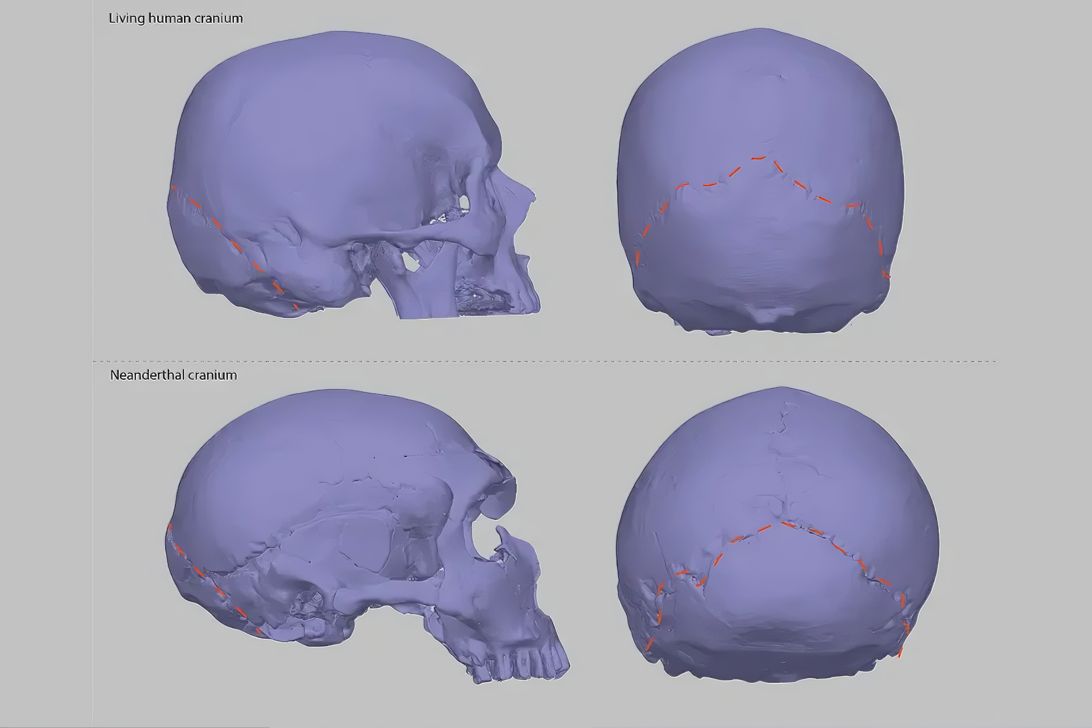 현생 인류 두개골은 구형으로 두개골 뒤쪽이 둥글지만, 네안데르탈인 두개골은 상대적으로 길쭉하고 두개골 뒤쪽이 더 각져 있다.