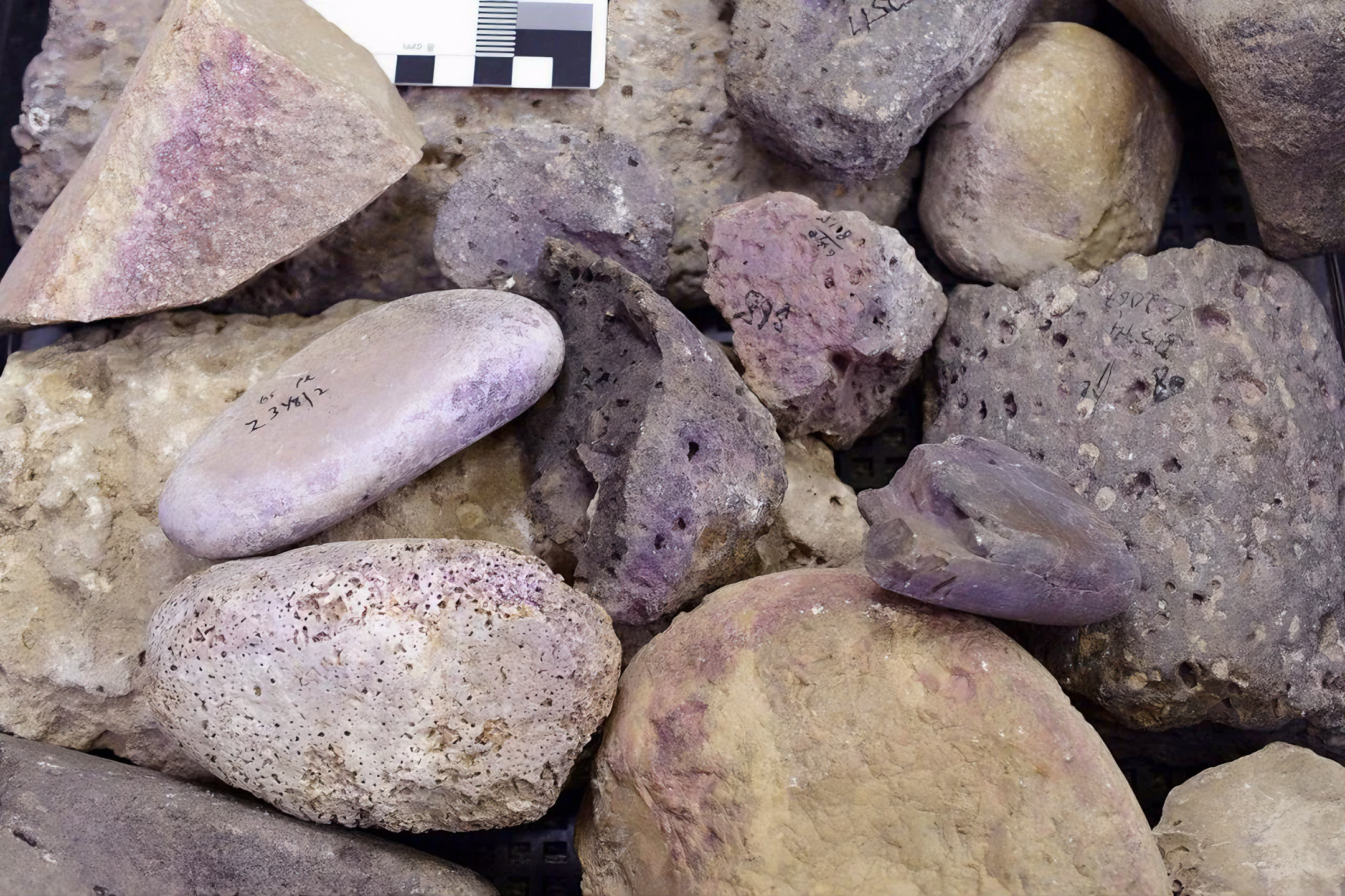 보라색으로 물든 석기들. 아마 연체동물을 빠갰을 것이다. Stone tools with purple dye residue. Credit: Maria Bukin; G. Shalvi et al., PLOS ONE (2025)