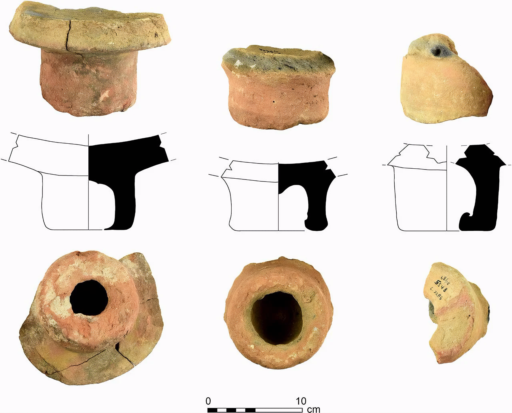 보라색 염료통 바닥면 측면, 단면, 밑면(사진: Maria Bukin, 도면: Vladimir Lehem). 출처: G. Shalvi 외, PLOS ONE (2025)