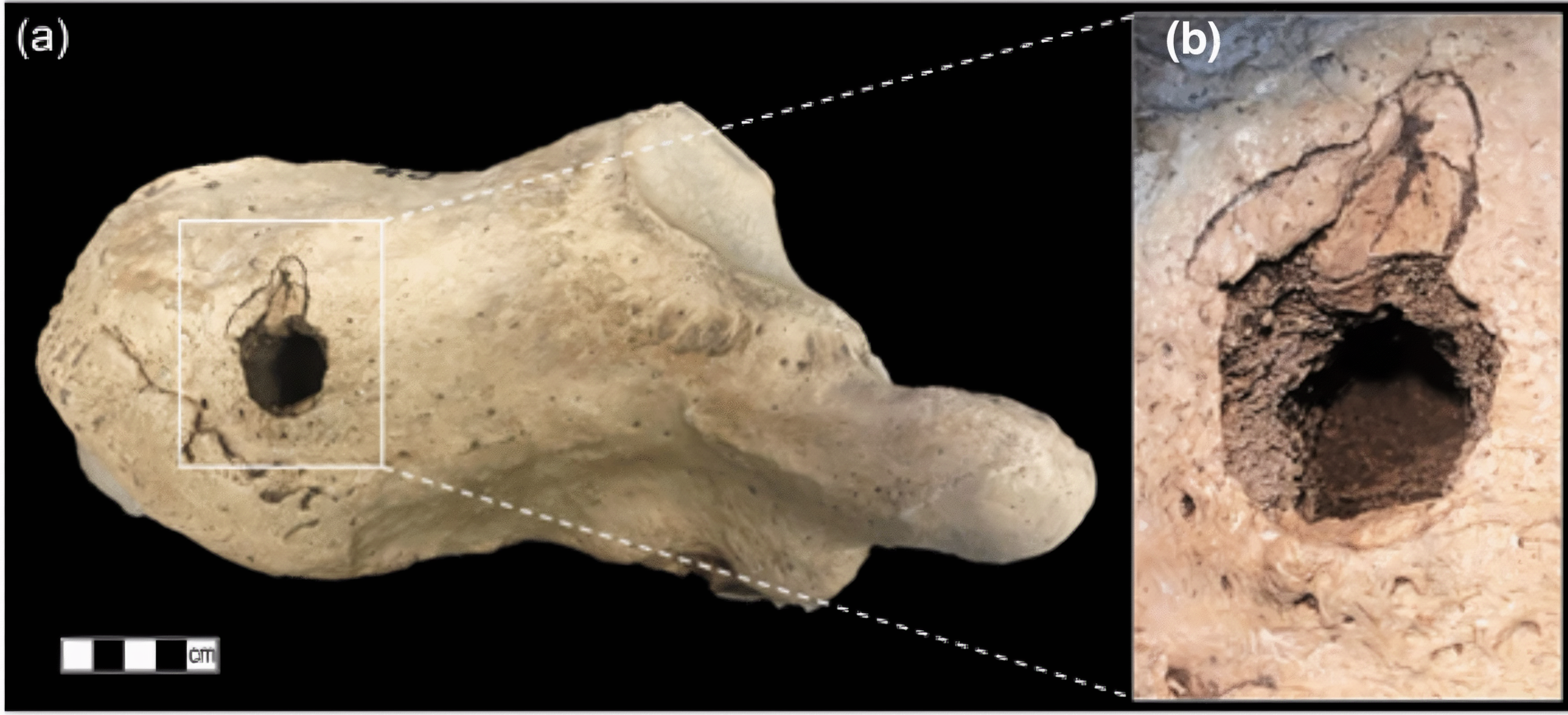 이 자국 모양은 끝이 날카롭지 않고 둥글었음을 보여주므로 저자들은 뼈, 상아 또는 단단한 나무로 만든 뾰족한 끝을 두꺼운 뼈를 뚫을 만큼 충분한 힘과 회전으로 박아 넣은 단단한 나무 막대였을 가능성을 시사한다.