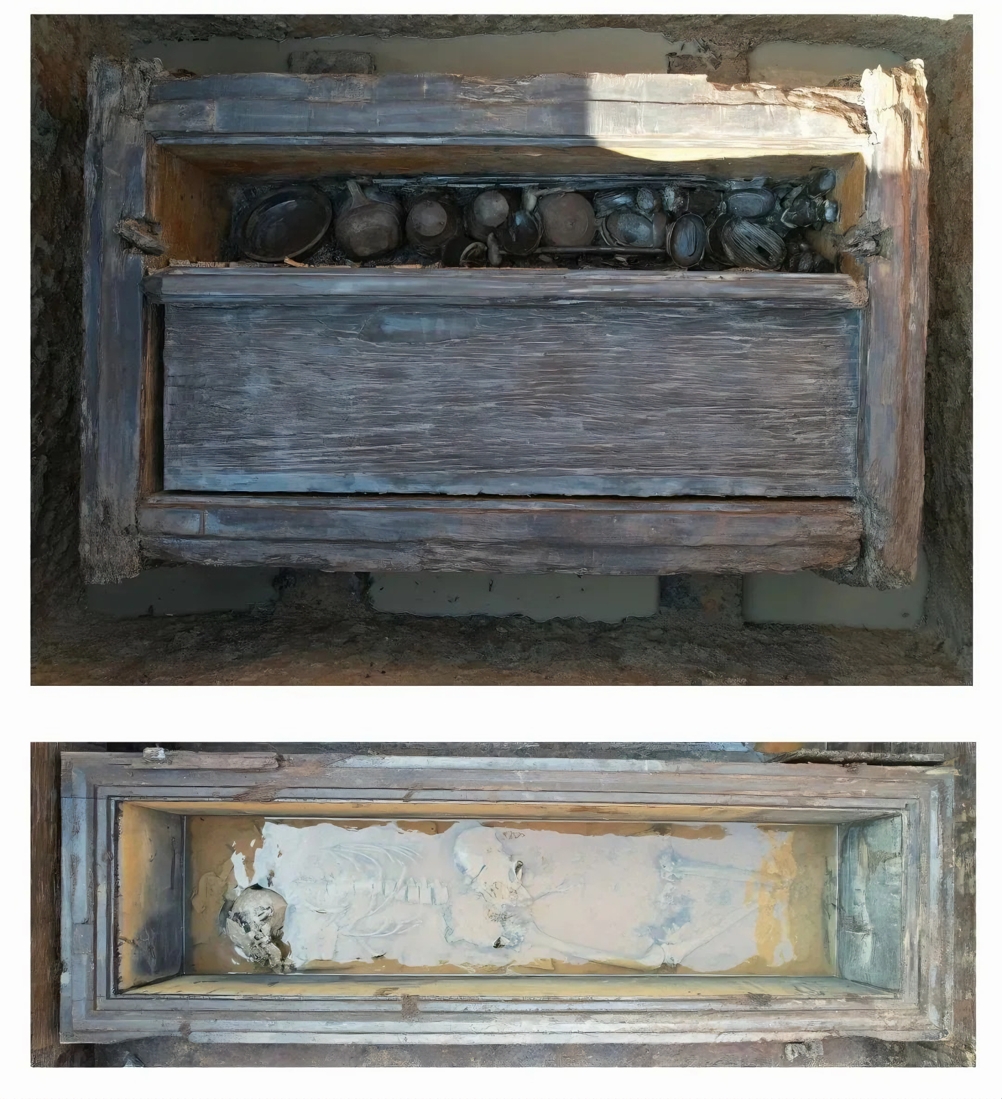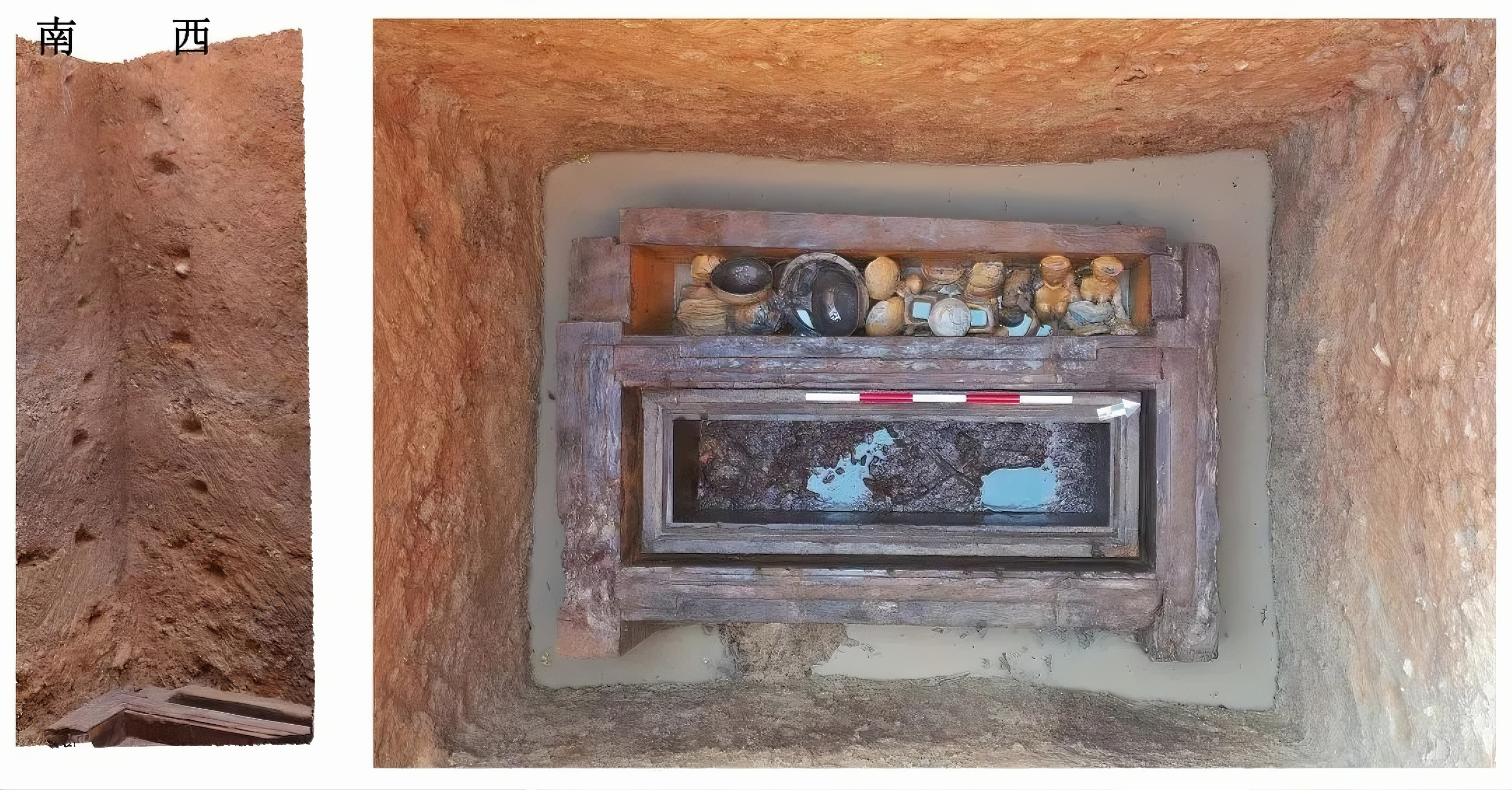 관은 모두 썩었고, 무덤 밑바닥에는 관 흔적이나 침목 홈이 보인다.