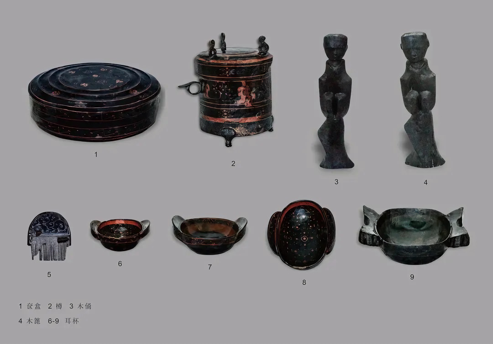 보존 상태가 좋은 데서는 껴묻거리를 비교적 풍부하게 옆칸에다 두었다. 초나라 무덤에서 흔히 보는 청동솥铜鼎, 청동 항아리[铜壶와 铜罐], 청동세숫대야铜洗, 나무인형木俑, 나무잔木耳杯이 수습됐다.
