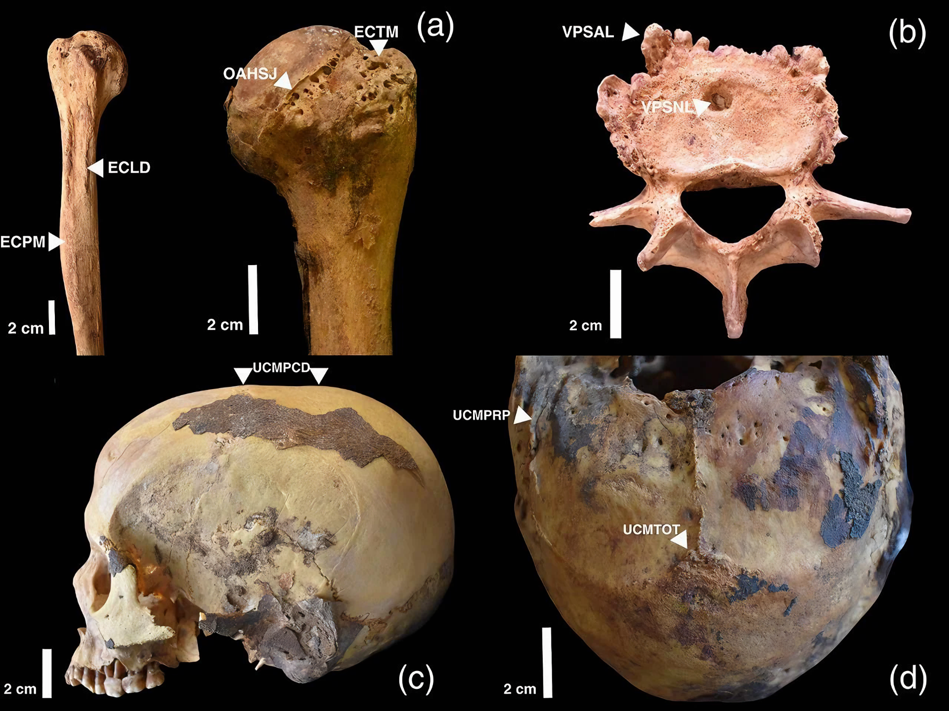 반면 여성 유골은 경추 cervical vertebrae와 두개골에 극심한 변형을 보였는데, 이는 수십 년 동안 무거운 짐을 운반하는 데 사용한 머리끈head straps(텀플라인tumplines)의 전형적인 흔적이다.