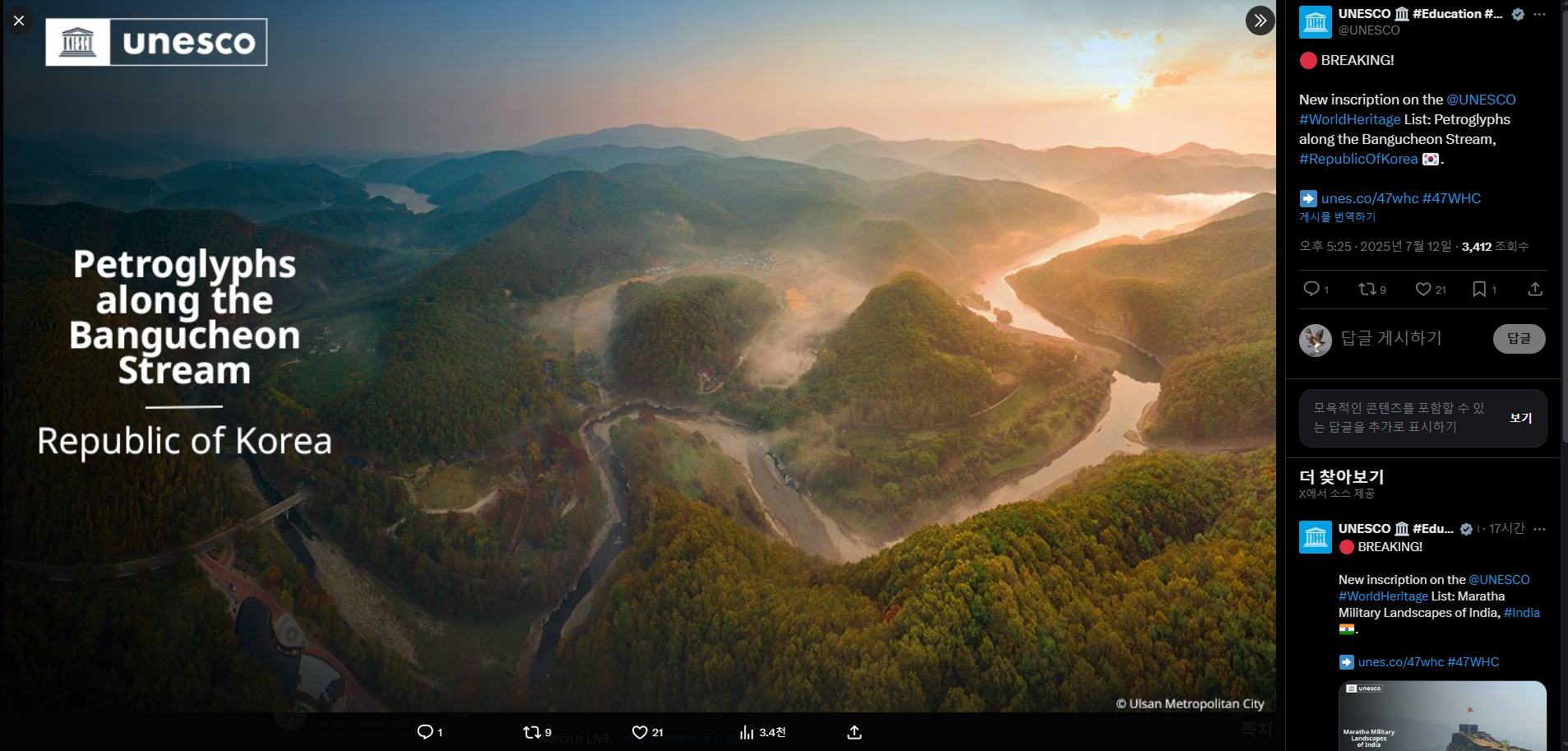 한국이 신청한 반구대변 암각화 유산[영문명 Petroglyphs along the Bangucheon Stream]이 세계유산에 등재되었을 알리는 유네스코 세계유산위원회 WHC X계정이라