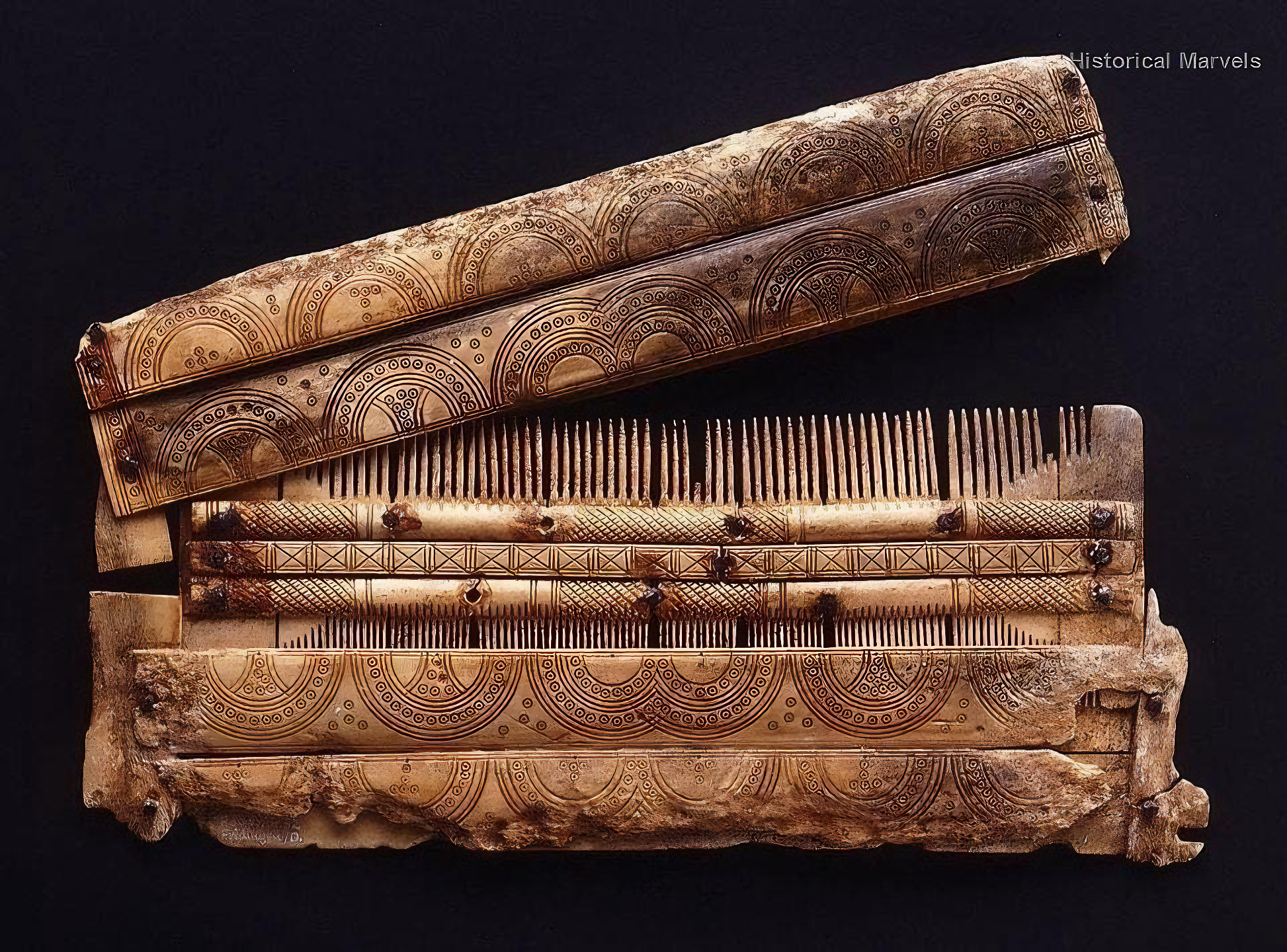 7세기 초로 거슬러 올라가는 이 정교하게 장식한 빗은 당시의 장인 정신을 잘 보여주며, 섬세한 빗살을 보호하기 위해 케이스에 보관되었다.