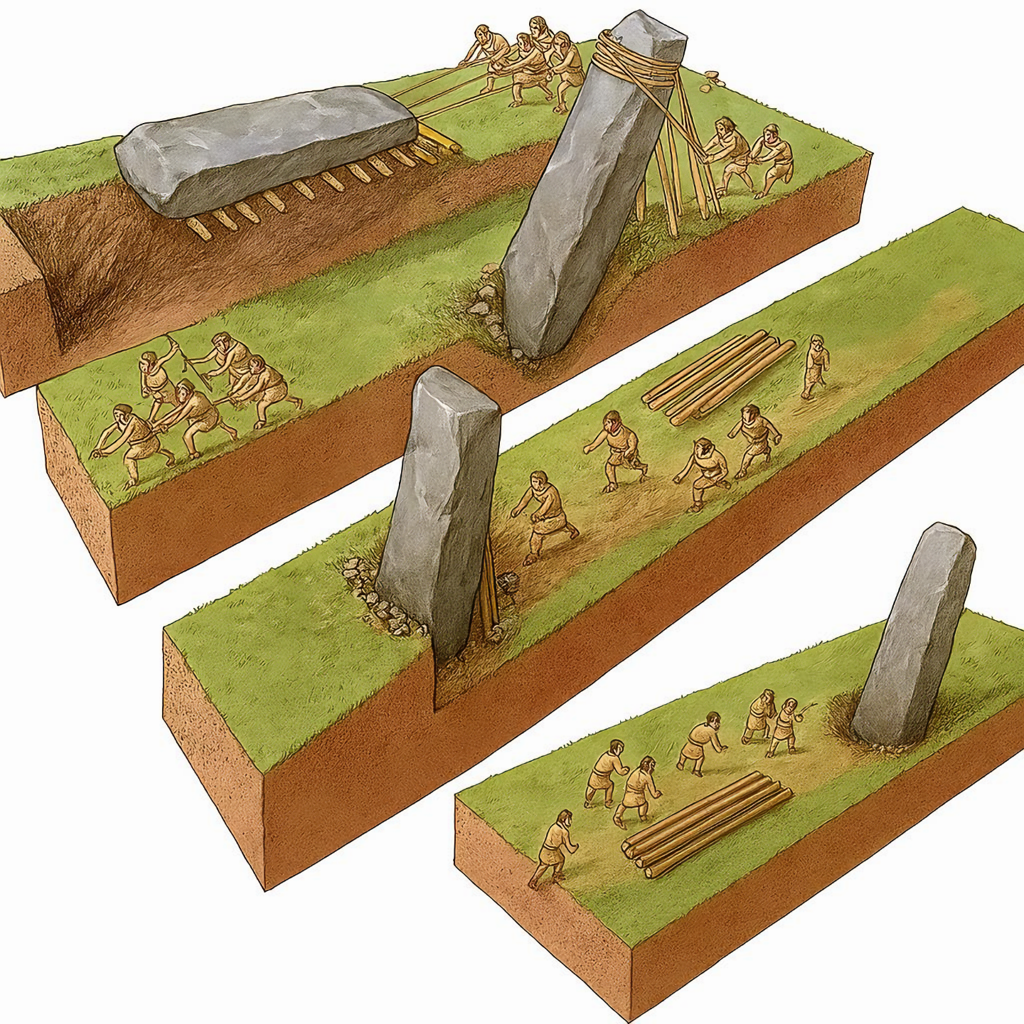 이는 신석기 사회가 스톤헨지Stonehenge, 카르나크Carnac, 괴베클리 테페Göbekli Tepe와 같은 유적에 거대한 돌을 어떻게 운반하고 세웠을지 보여준다.