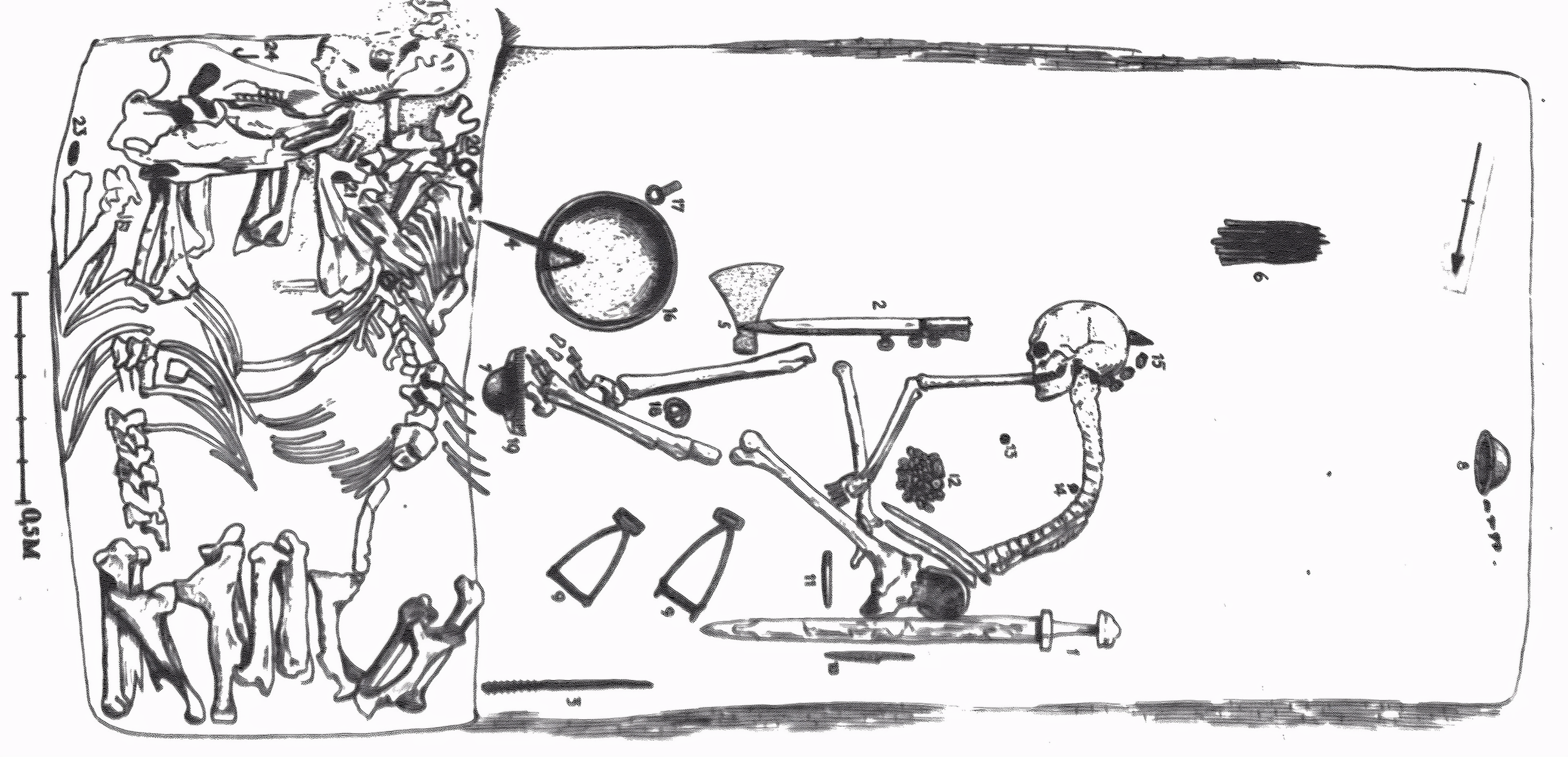 한 여성이 창으로 묻혔고, 몸에는 큰 돌이 있었다. 발목이 묶여 목을 매었을 가능성이 있는 그녀의 성인 아들도 무덤에 있었다.