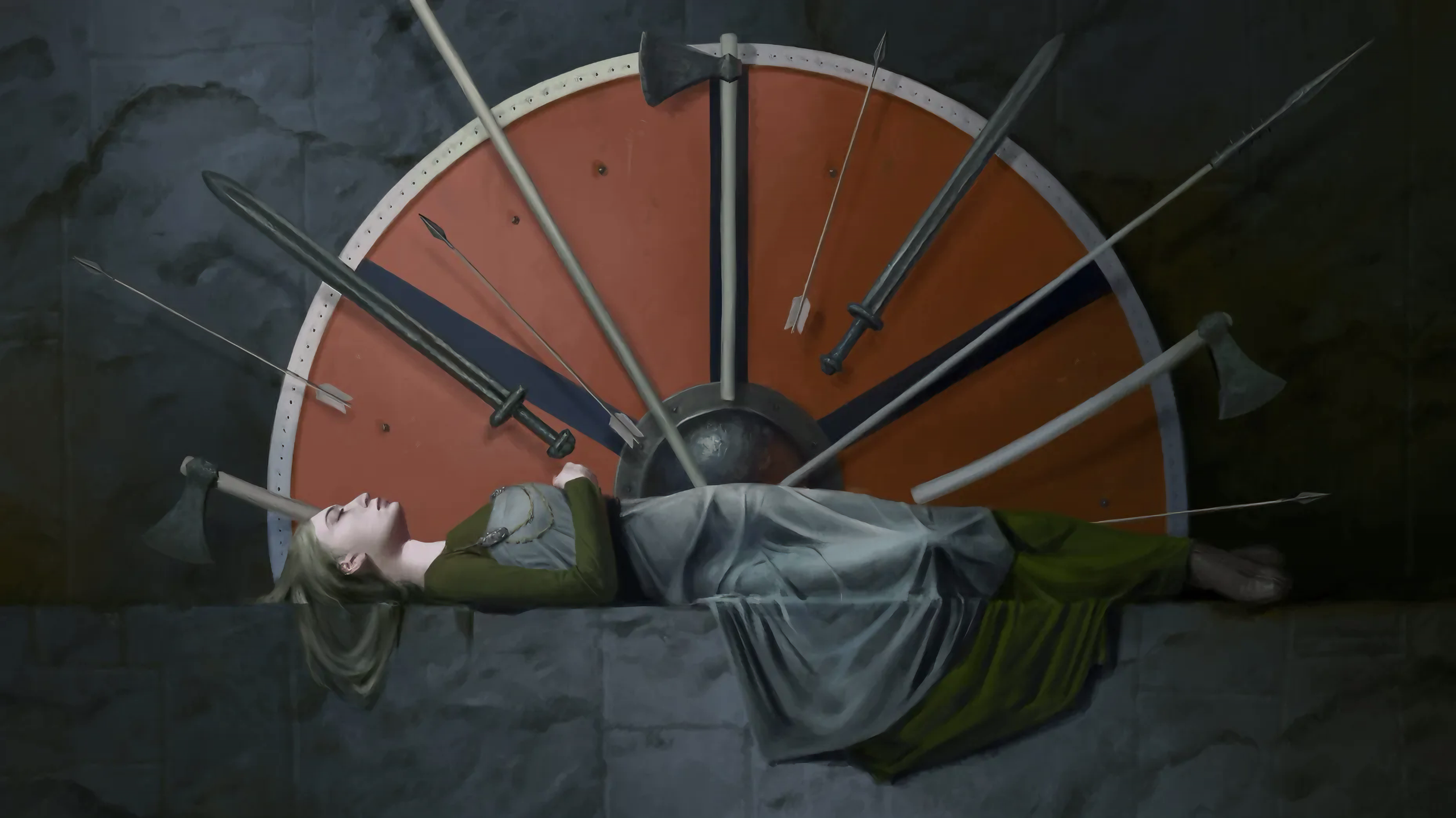그러나 방패 보스 shield bosses(방패 중앙에 있는 둥근 보호 금속 조각)와 같은 다른 장비나 화살촉과 도끼 머리ax-heads와 같은 가능한 무기를 포함하는 더 많은 여성 매장이 있다.