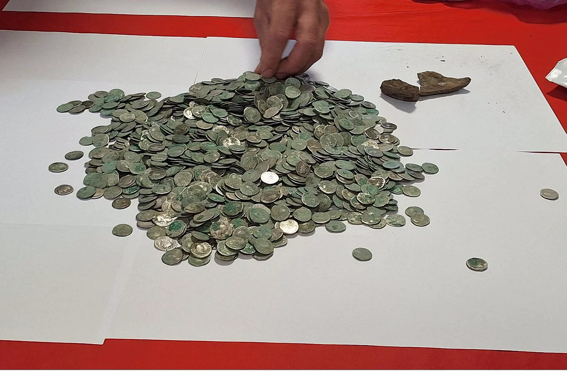 그는 무려 1,469점 로마 은 데나리우스silver denarii를 발견했는데, 이는 그가 추정하기로는 거의 2,000년 전 것이다. 이 동전은 서기 54년 네로 황제 시대부터 서기 161년 마르쿠스 아우렐리우스 황제 시대까지 제작되었으며, 11명의 황제와 황후 모습이 새겨졌다.