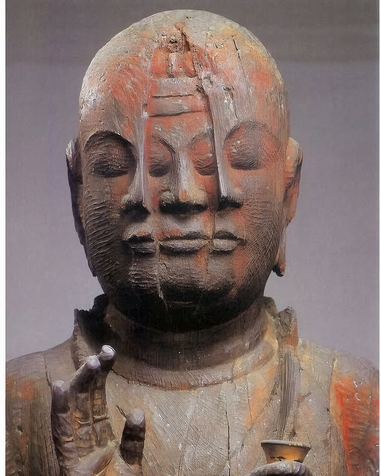 A wooden statue of the priest Baozhi, transforming into the Eleven-Headed Avalokitesvara Bodhisattva upon reaching nirvana. 11th century, Heian Period. Currently on display at the Kyoto National Museum.