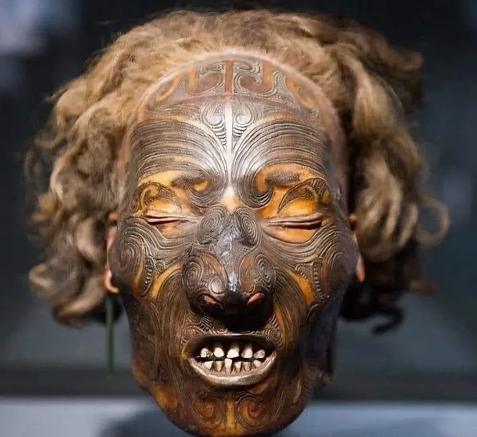 보존된 이 두상에는 전통적인 타 모코 얼굴 문신이 있으며, 19세기 초 머스킷 총 전쟁 Musket Wars 당시 매우 인기 있는 무역품이 되었다.