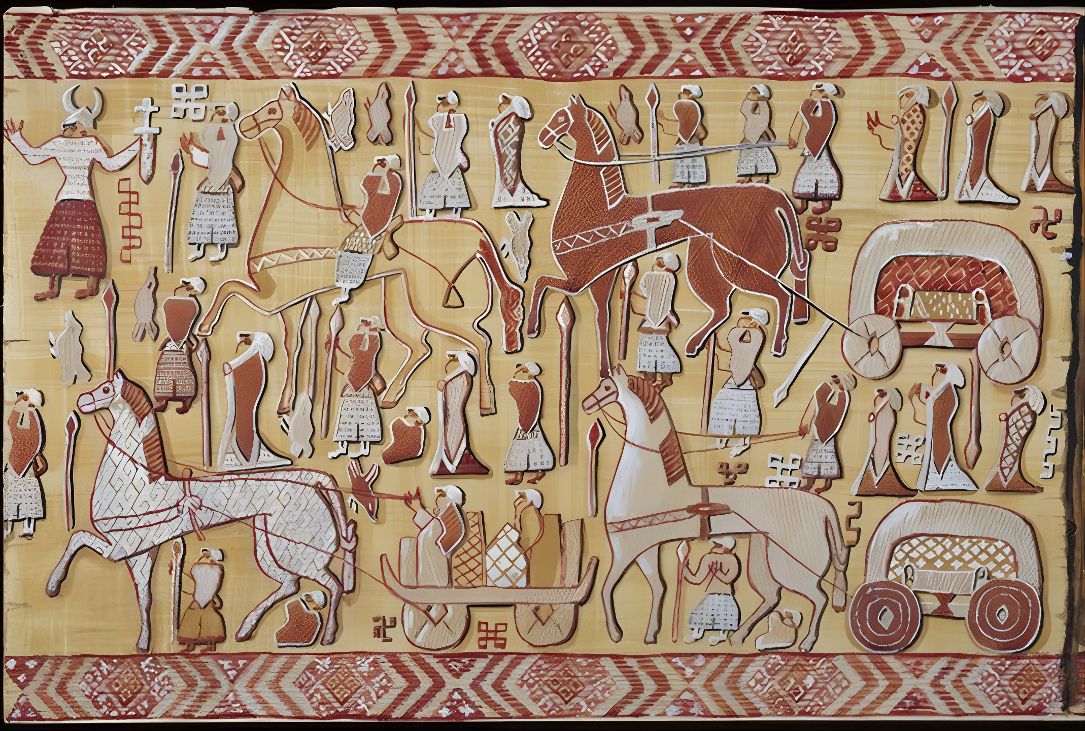 양모, 비단, 아마flax로 만든 태피스트리에는 사람, 동물, 바퀴 달린 탈것 등이 묘사되어 있니다.