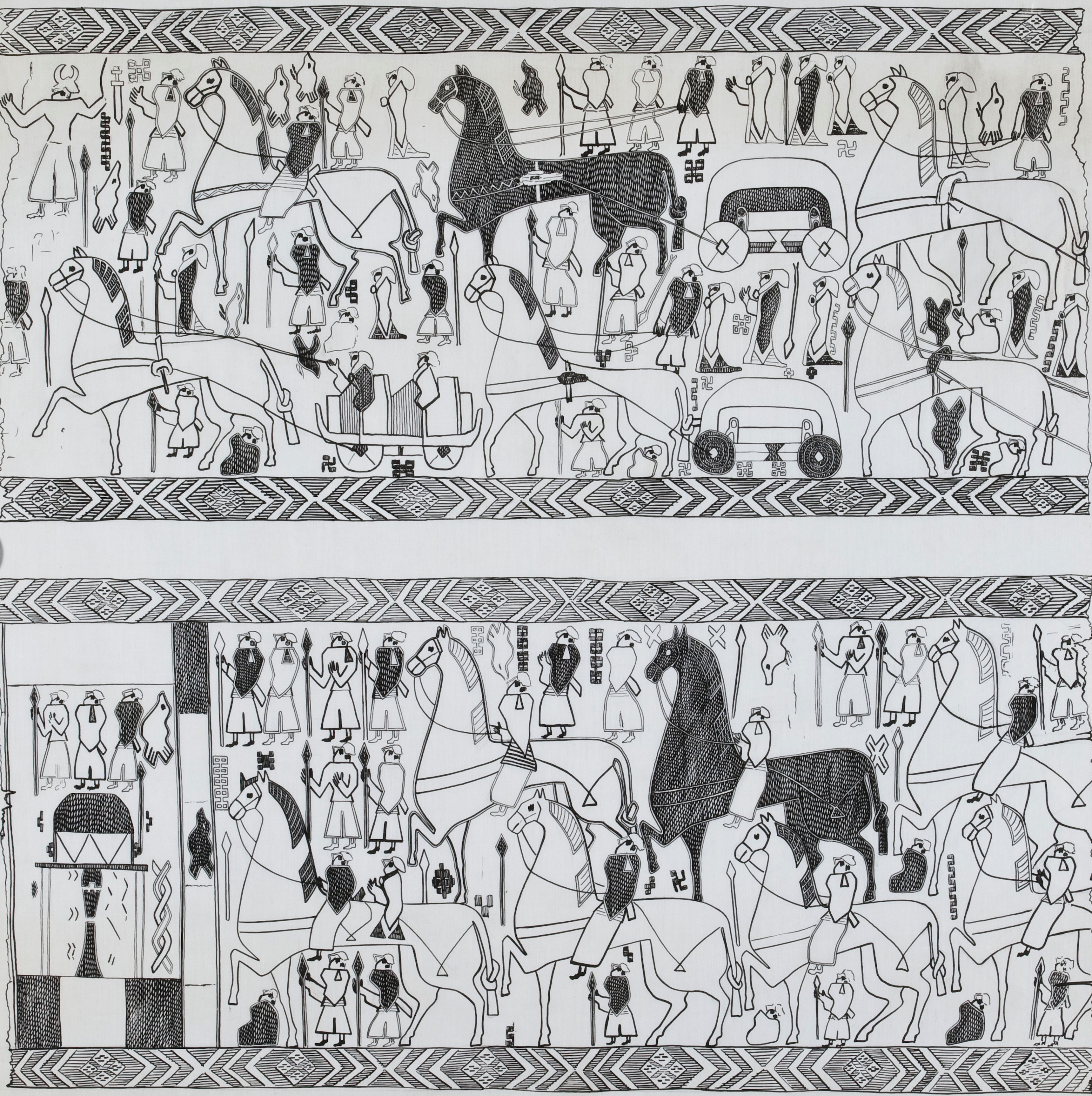 사람, 동물, 마차, 집이 뒤섞인 모습은 북유럽 신화의 생명나무인 이그드라실Yggdrasill을 상징하는 큰 나무를 향해 장례 행렬이 향하는 모습을 암시한다.