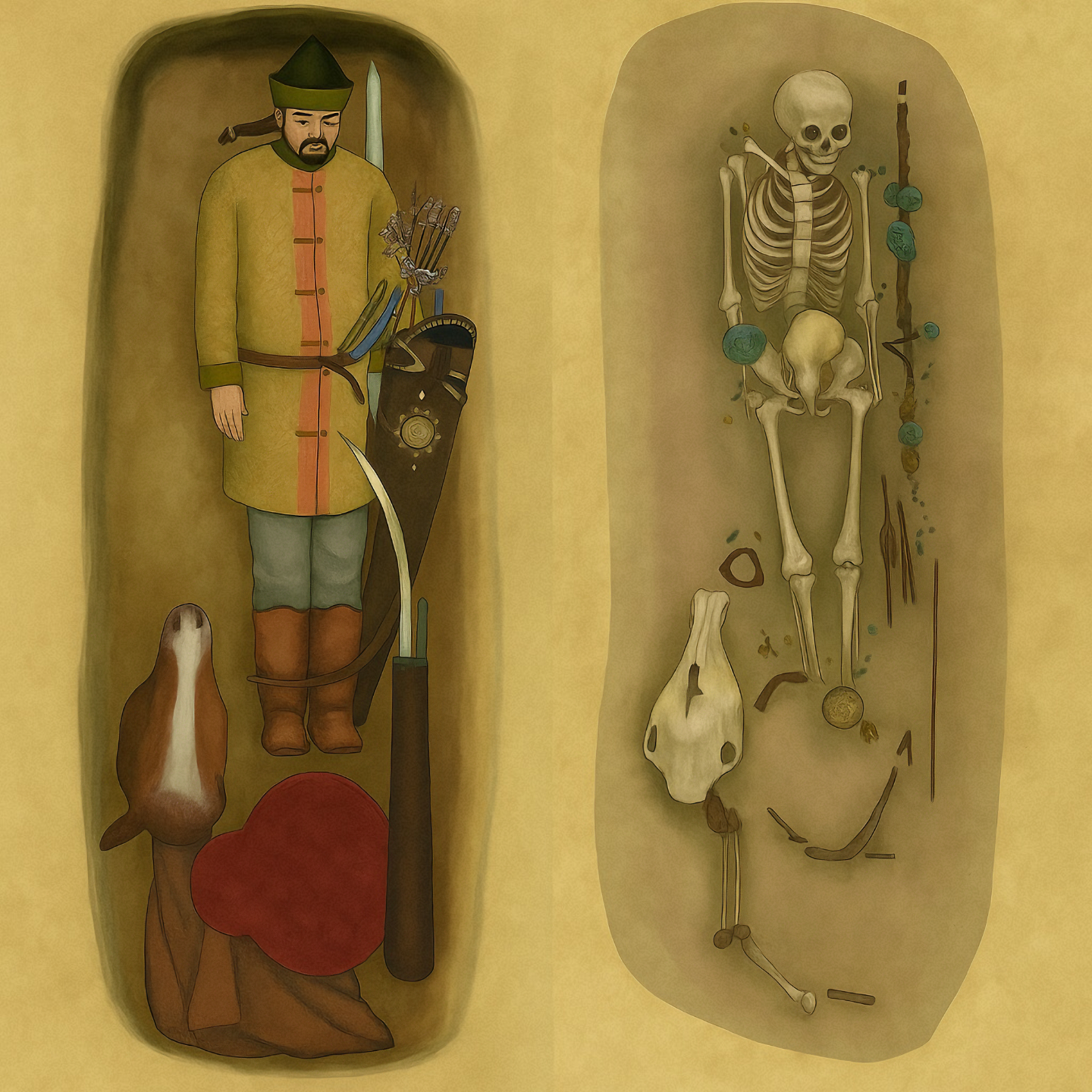 카로스-에페르예스쇠크(Karos-Eperjesszög)에 있는 헝가리 정복 시대 묘지 11호 무덤 매장 양상과 그것을 토대로 하는 복원도다.