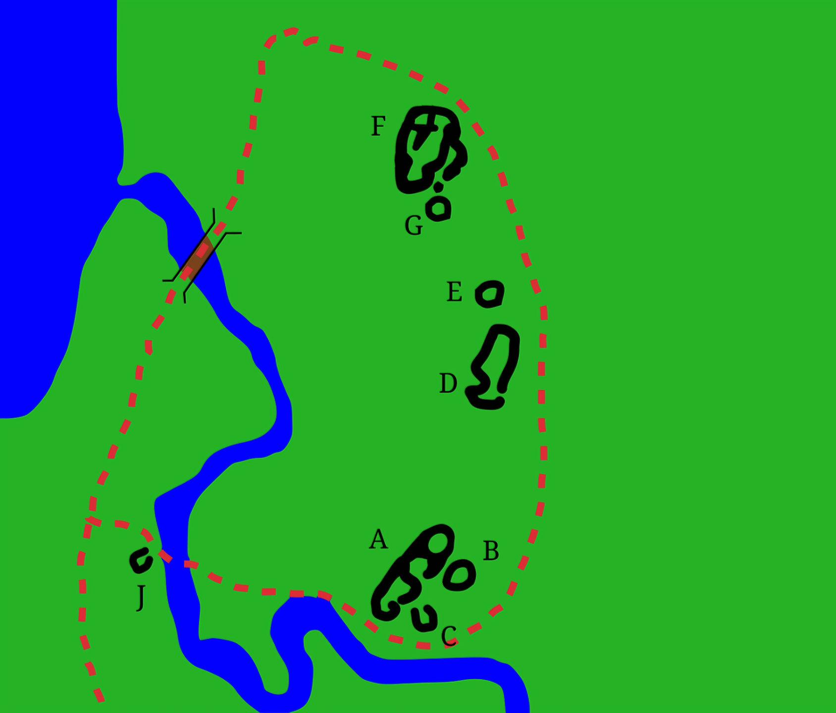 이 건물들은 다시 네 개 단지complexes라 할 만한 하위 구성단위를 보이니, 개중 두 개는 큰 홀 하나와 그 양옆에 작은 오두막hut (D-E 단지, F-G 단지)으로 이루어져 있었다.