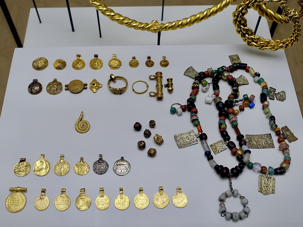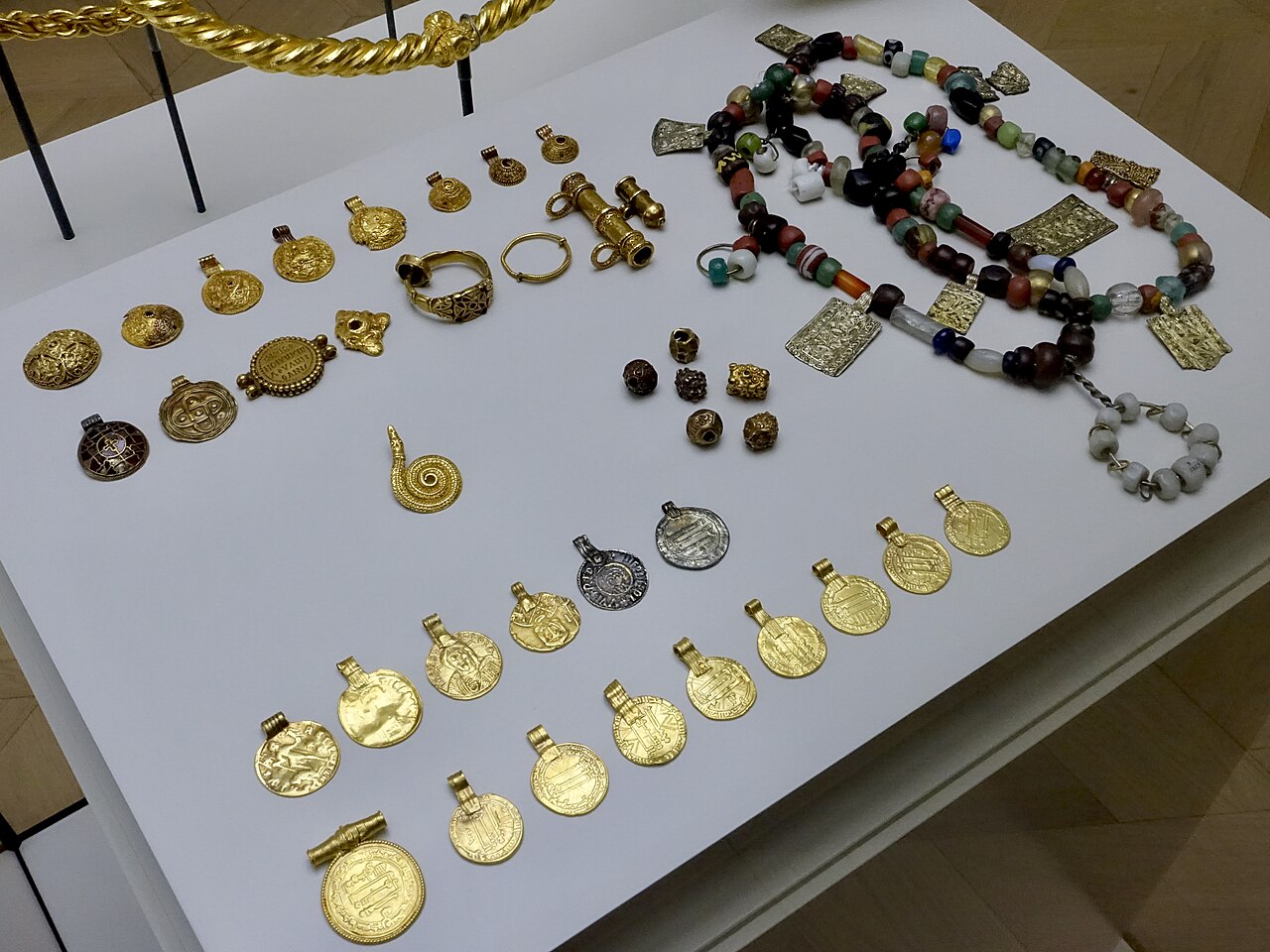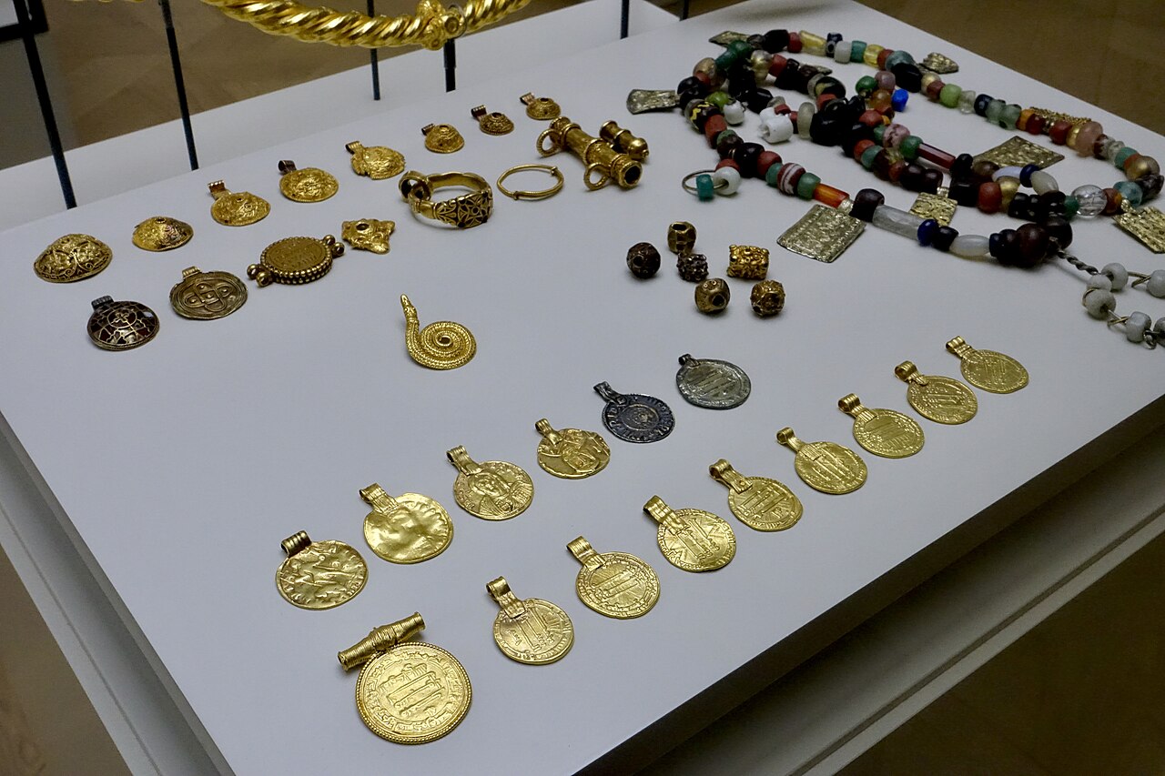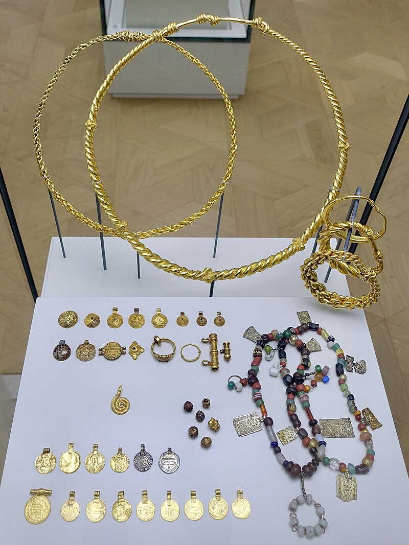 20개 동전(목걸이에 착용하기 위해 고리 모양으로 만듦. 역시 금), 132개 다채로운 유리 또는 준보석 구슬이 달린 목걸이, 2개 목걸이, 3개 팔찌, 1개 손가락 반지, 그리고 카롤링거 왕조 스트랩 마운트strap mount로 만든 삼각형 모양 세잎 브로치가 있다.