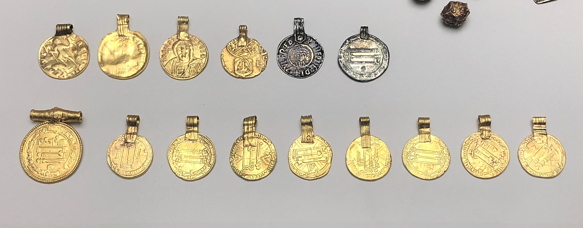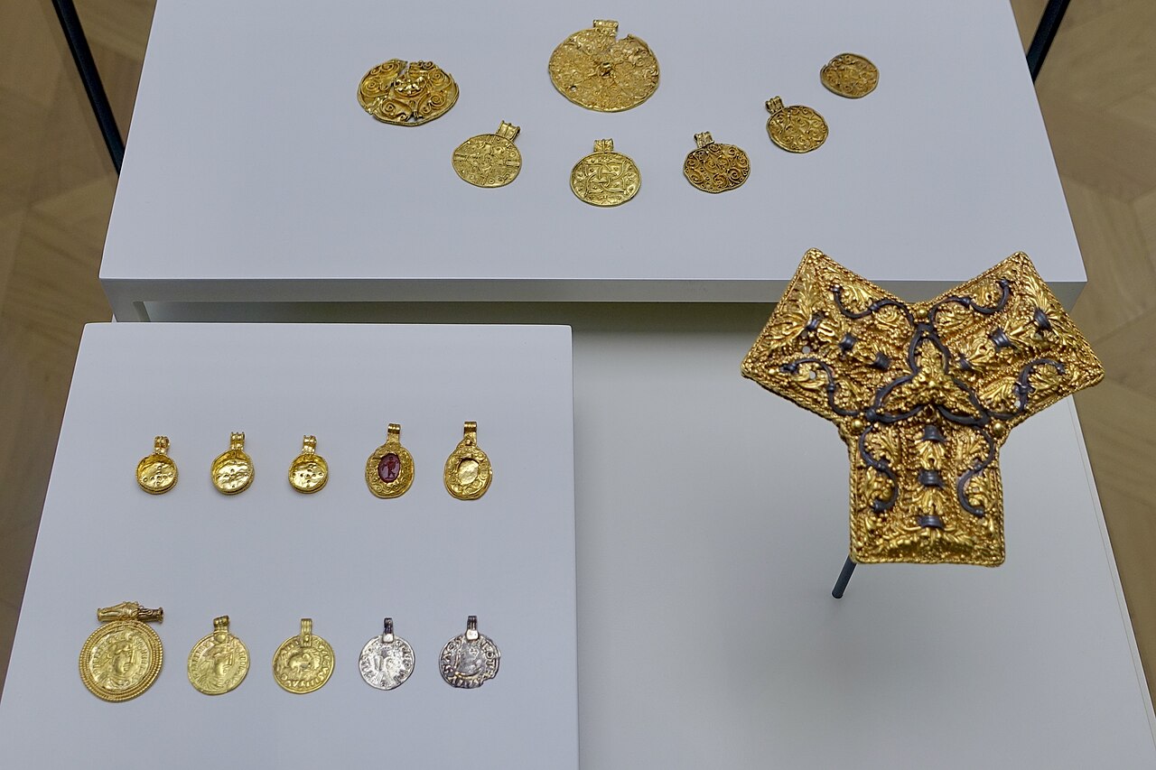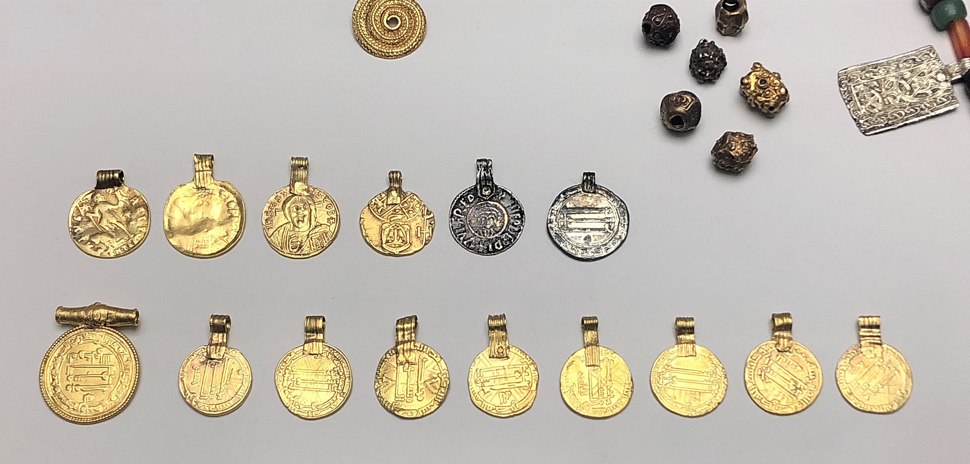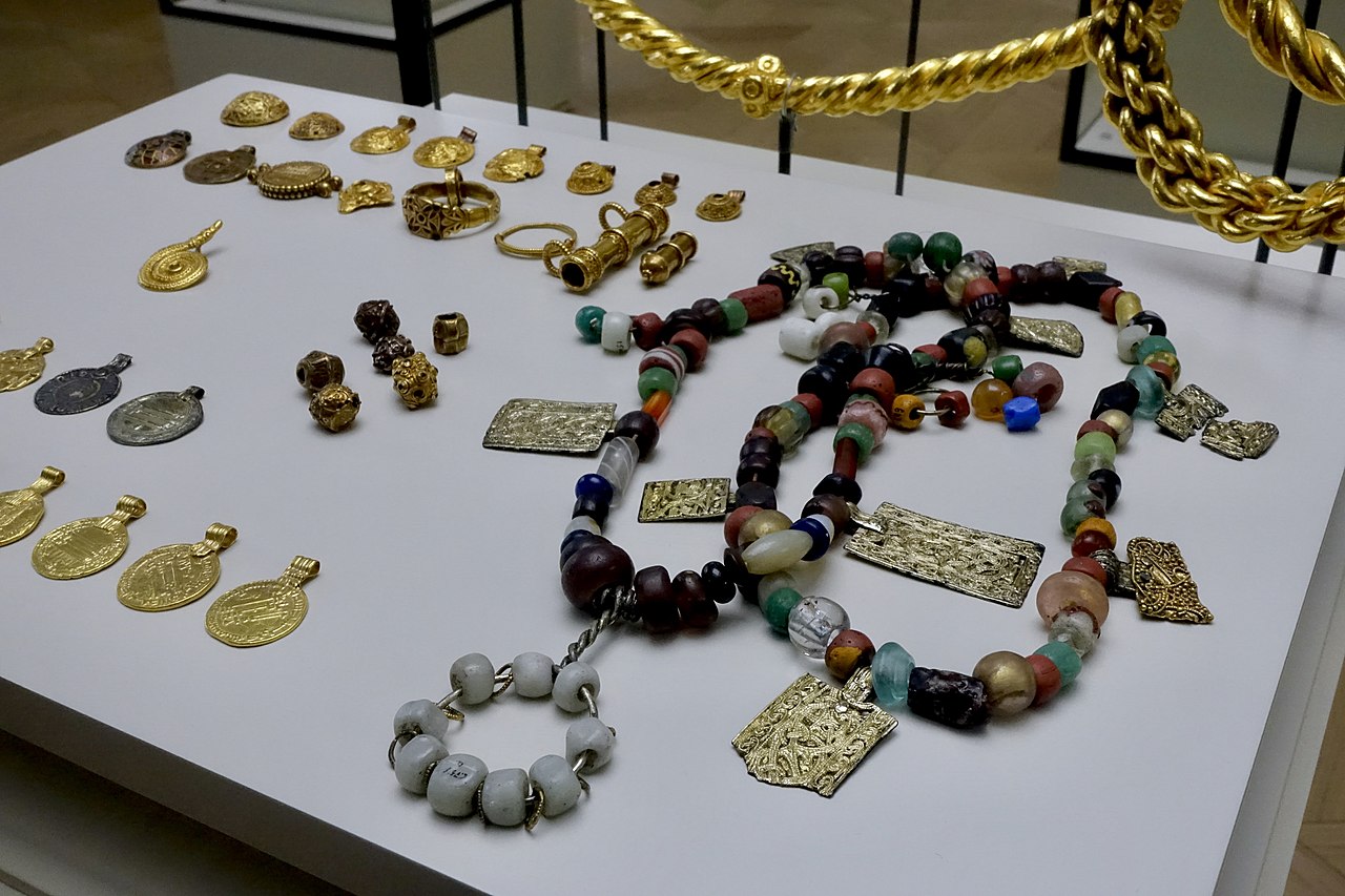 20개 동전(목걸이에 착용하기 위해 고리 모양으로 만듦. 역시 금), 132개 다채로운 유리 또는 준보석 구슬이 달린 목걸이, 2개 목걸이, 3개 팔찌, 1개 손가락 반지, 그리고 카롤링거 왕조 스트랩 마운트strap mount로 만든 삼각형 모양 세잎 브로치가 있다.