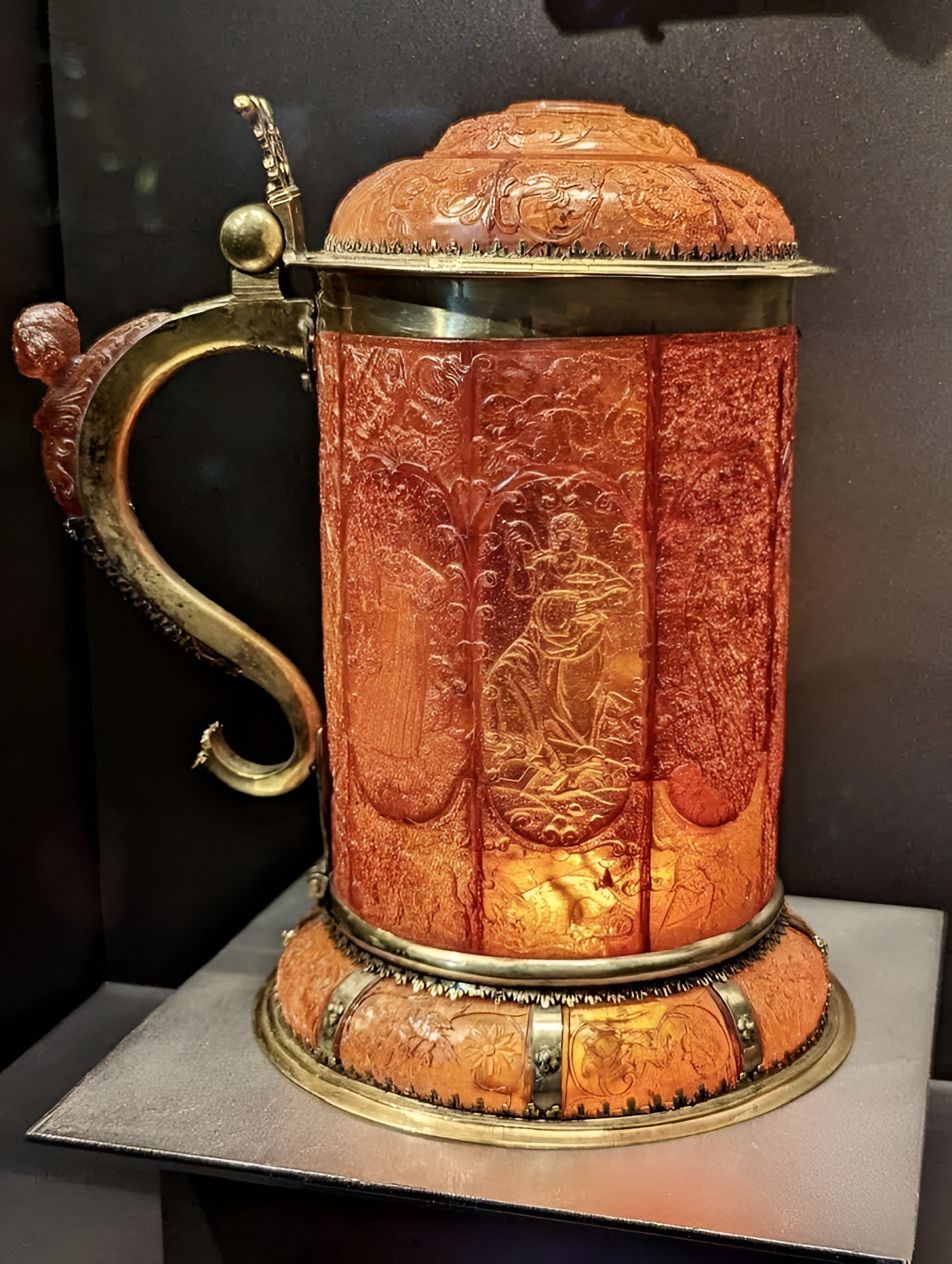 A beer mug with a silver frame set with carved amber. 1640-1660.