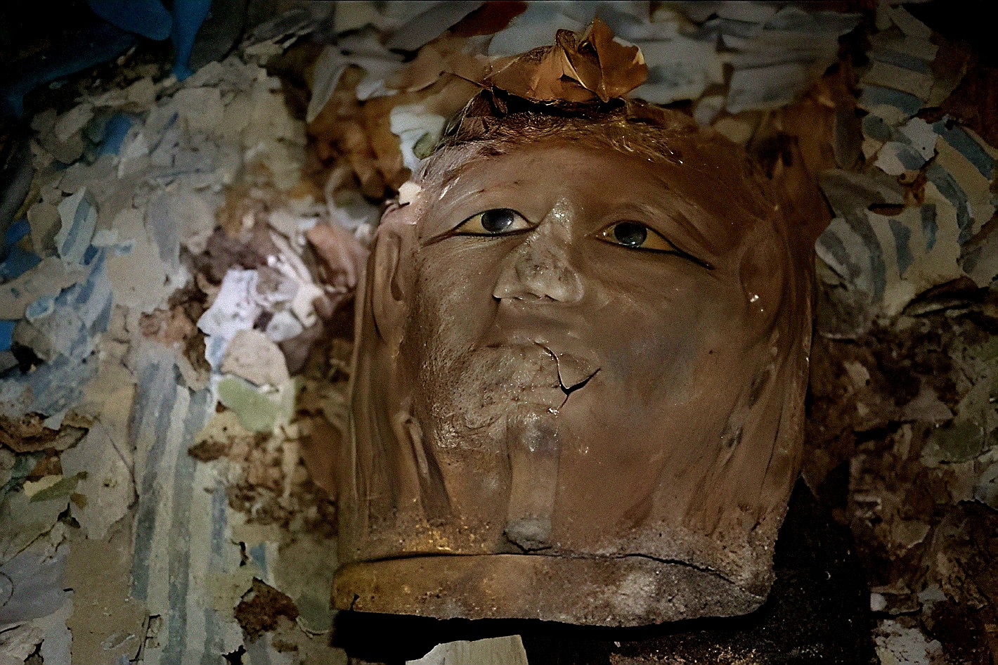 미라 머리 위에는 상감 방해석 calcite, 흑요석 obsidian, 오닉스 눈 onyx eyes 이 있는 희귀한 금박 은 가면 gilded silver mask 이 놓여 있었다.