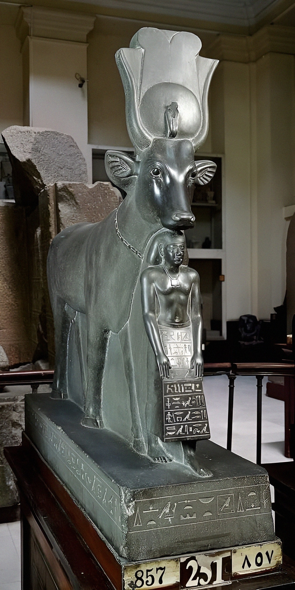 수석 필경사 chief scribe 프사메틱Psametik을 보호하는 신성한 소 형태를 한 하토르 여신상인데