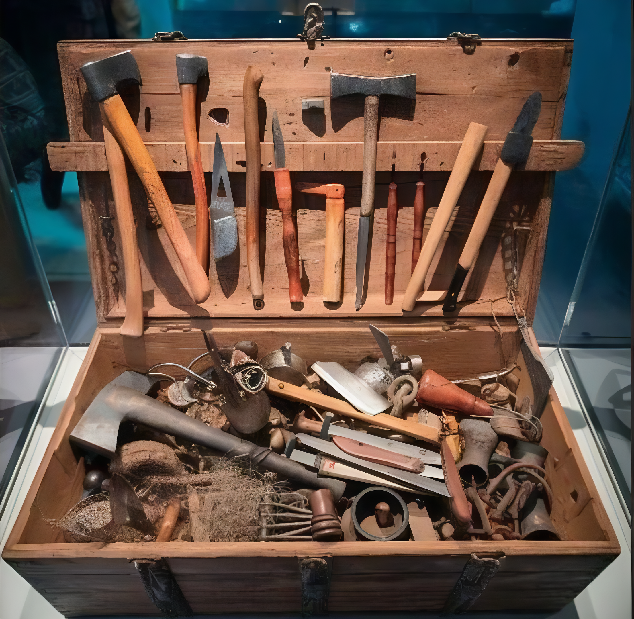 200점이 넘는 대장간 및 목공 도구, 원자재, 반제품이 상자 안에서 발견되었다.