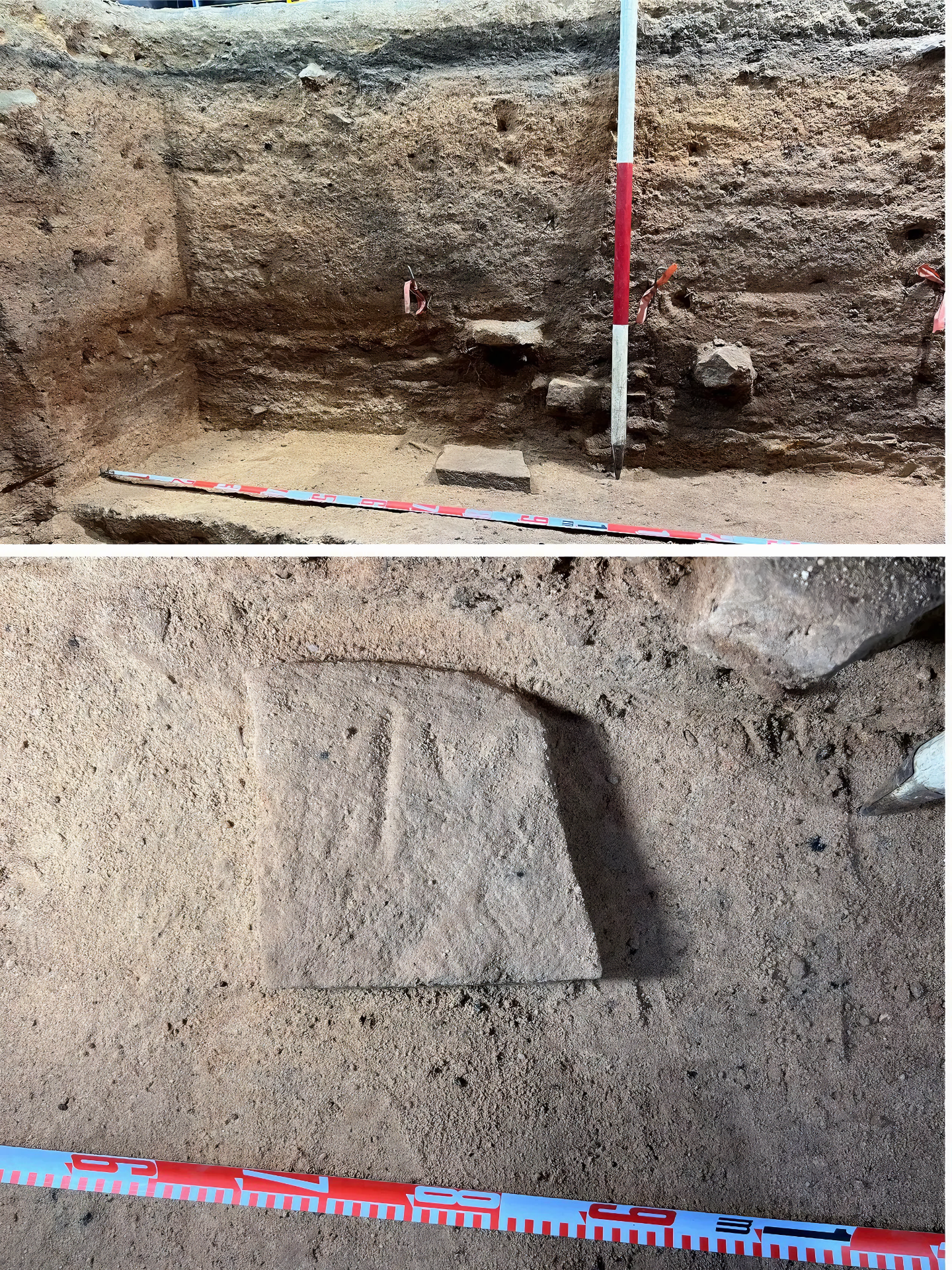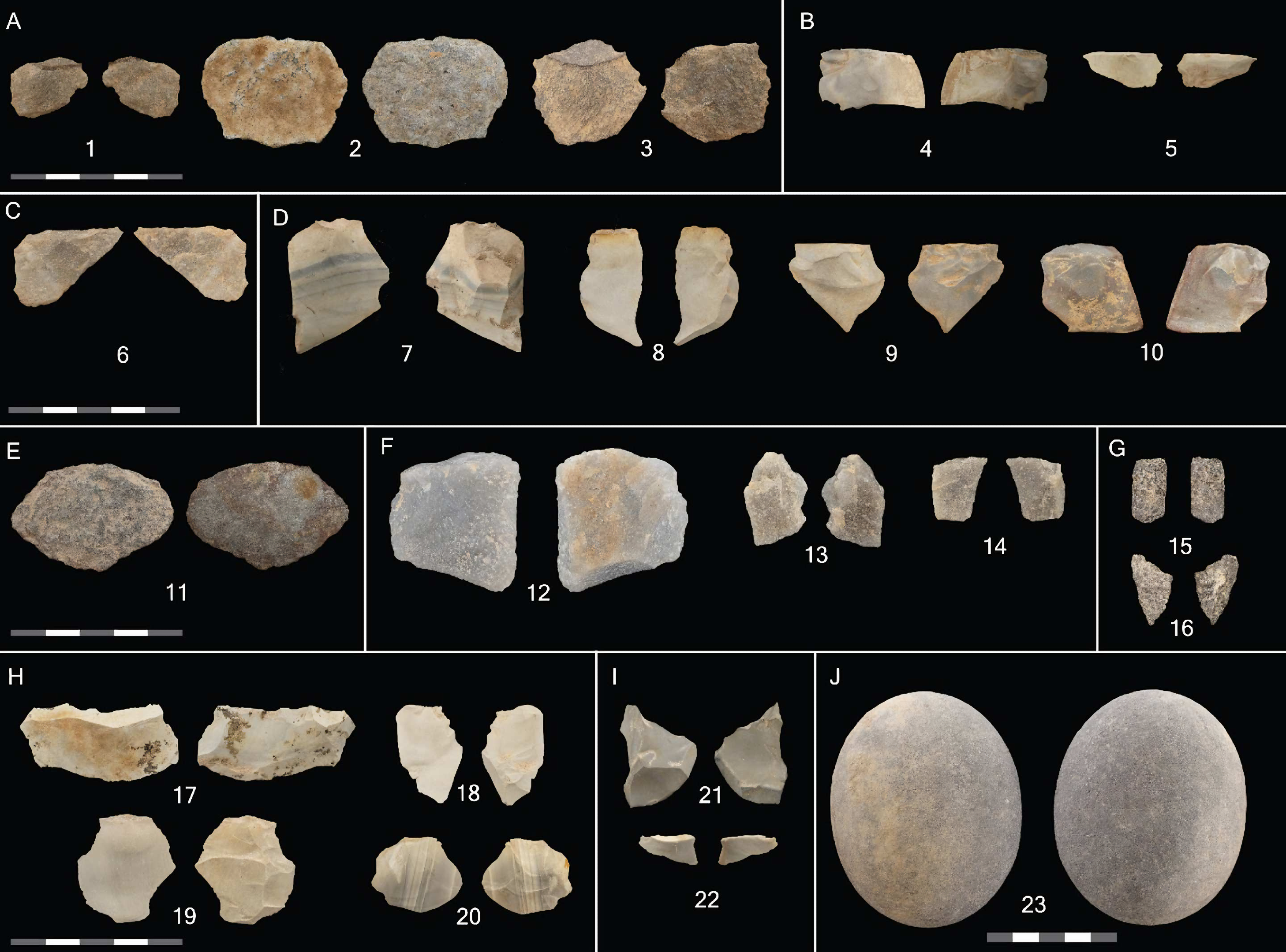 좀 더 깊이 파고 들어가니 약 13,000년 전 사암 분쇄판sandstone grinding slab이 발견되었는데, 홈이 파여 있어 뼈나 나무 도구를 만드는 데 사용되었을 것으로 추정한다.