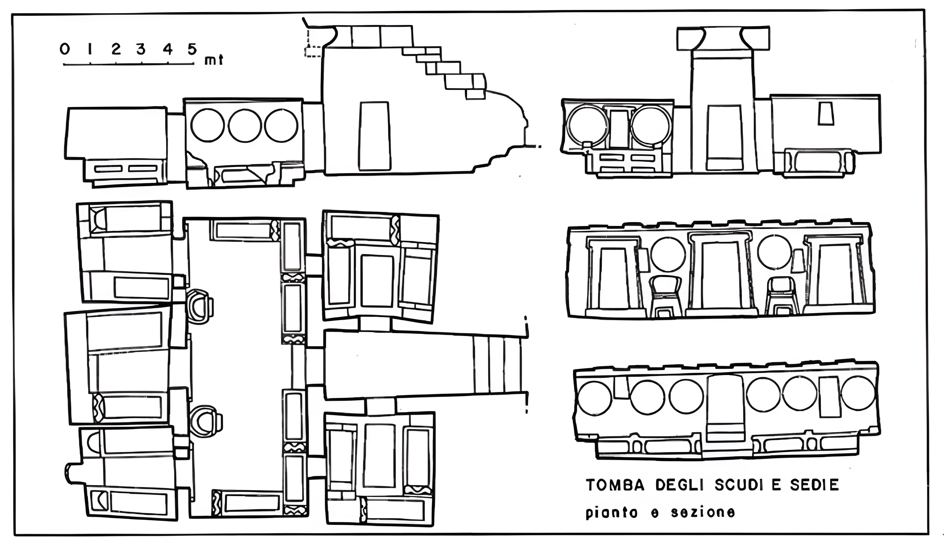 고전시대 에트루리아 Archaic Etruscan  주택의 목재 가구와 목재 건축물을 모방하여 석회암 기반암 tufa bedrock 을 조각해 침대 6개와 발판 footstools 이 있고 등받이가 높은 의자 high-backed chairs 2개, 문틀 door frames 과 천장 들보 ceiling beams 를 조각했다.