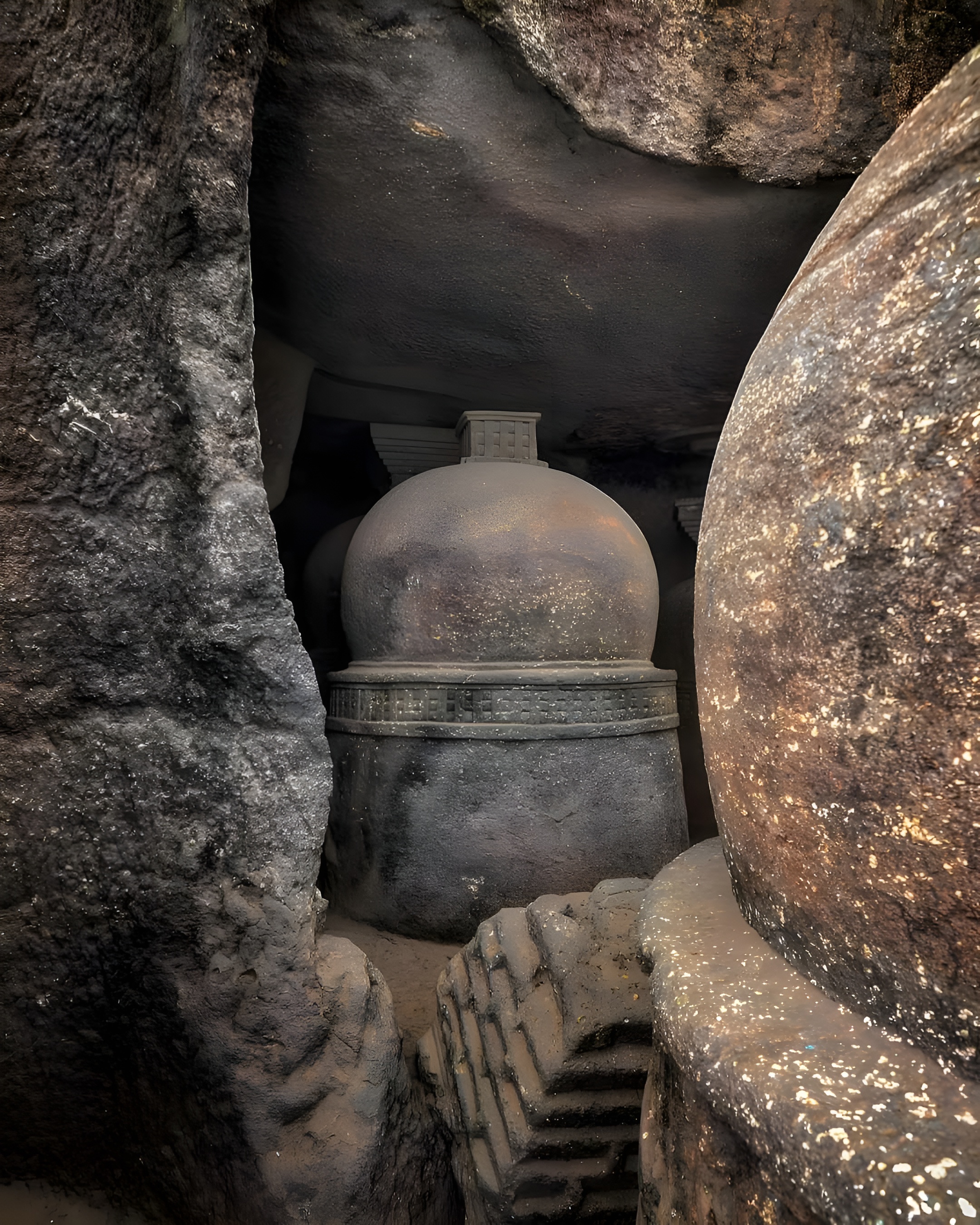 중요 특징 중 하나인 수많은 사리탑이다. 가장 눈에 띄는 발굴은 아치형 말굽형 천장 vaulted horseshoe ceiling 이 있는 목조 건축 양식 초기 발전을 보여주는 좋은 예인 차이티아chaitya(또는 chaityagrha – Cave XII)다.