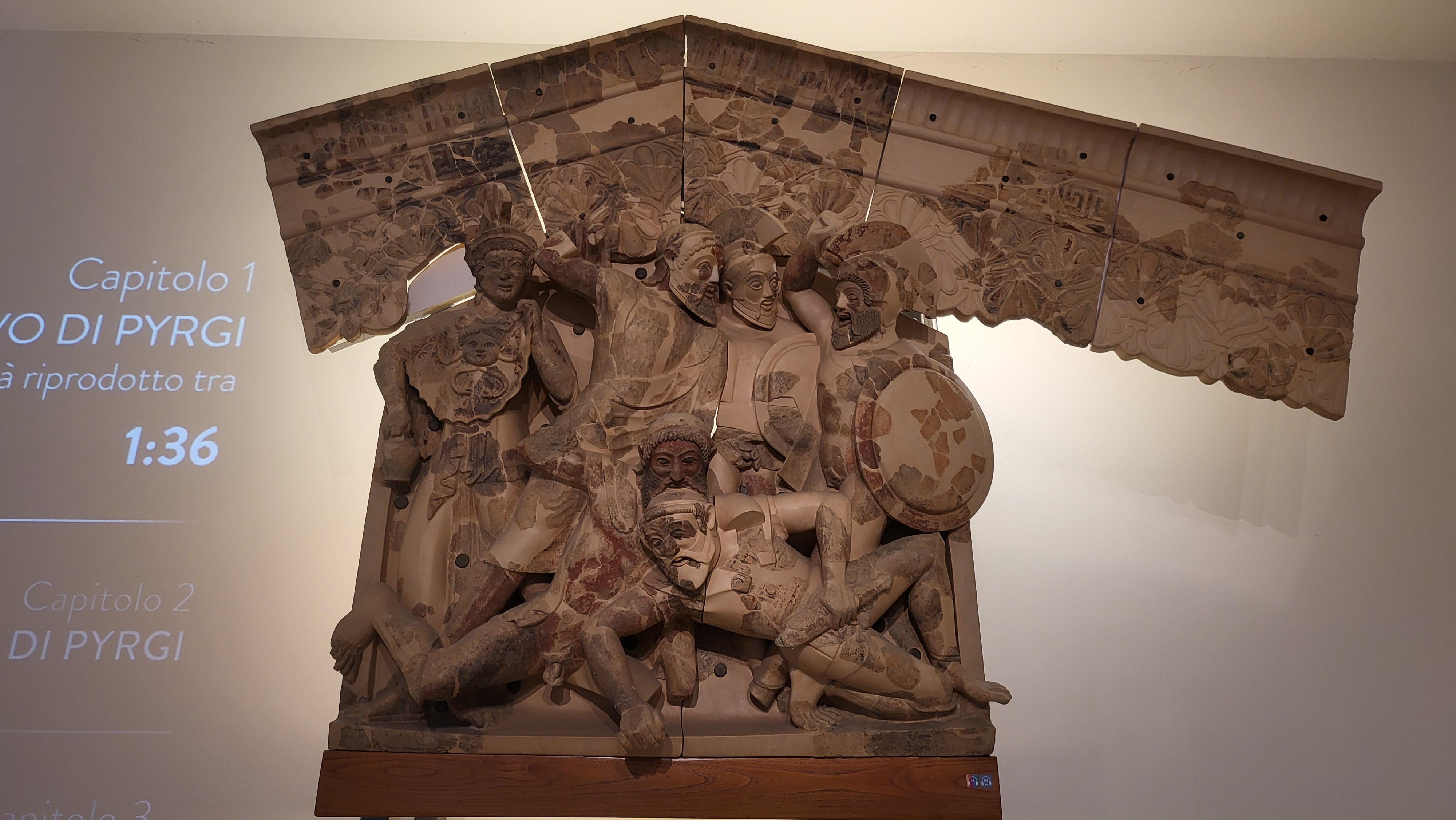 멜라니푸스Melanippus의 두개골을 삼키는 티네우스Tydeus가 있는 피르기Pyrgi의 재구성된 페디멘탈 고부조[테바이드Thebaid의 에피소드] A reconstructed pedimental high relief from Pyrgi with Tydeus devouring the skull of Melanippus (episode from the Thebaid)