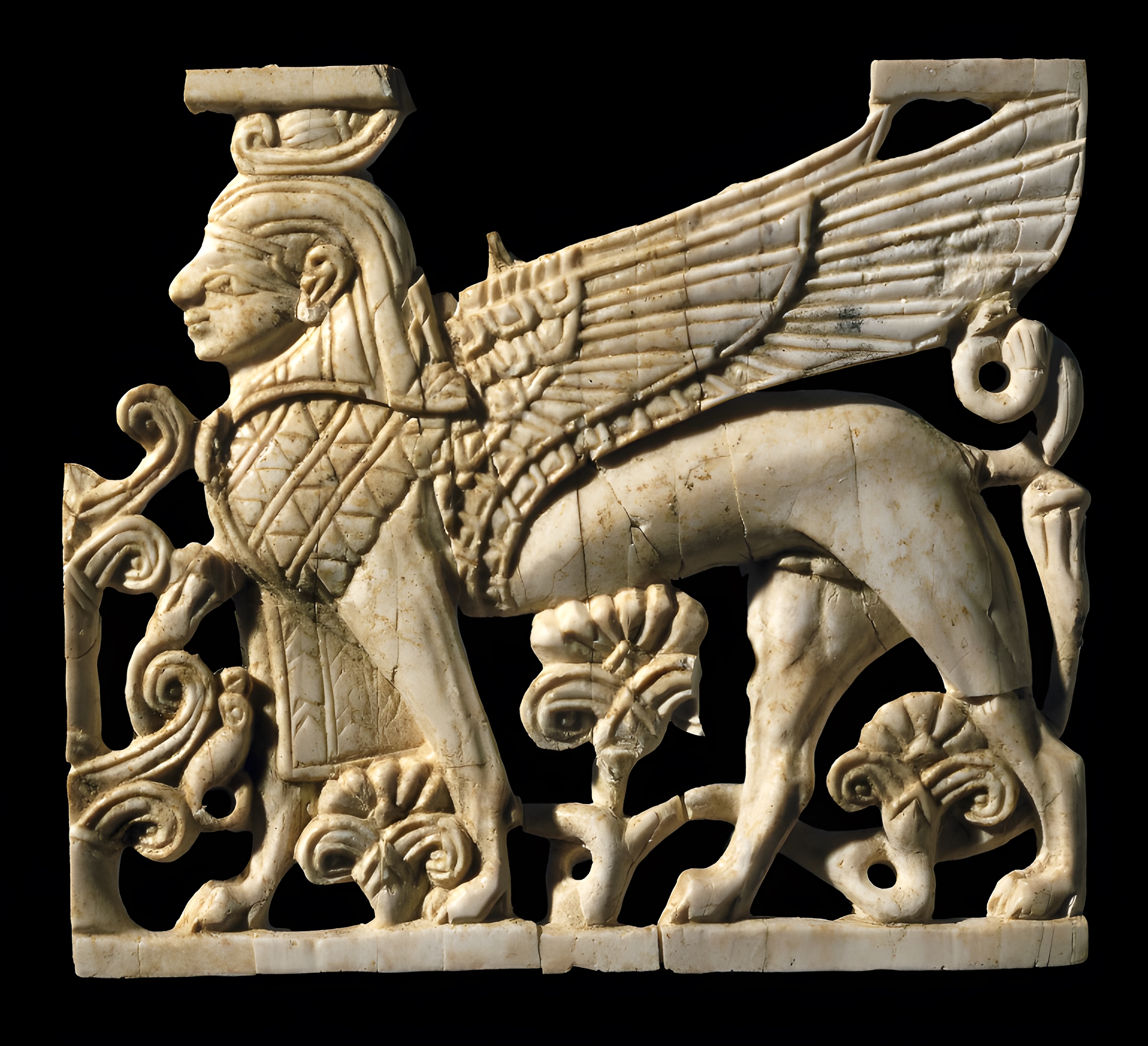 투각한 아이보리 패널: 조각 ; 꽃 피는 식물 사이를 걷는 인간 머리 날개 달린 수컷 스핑크스다.