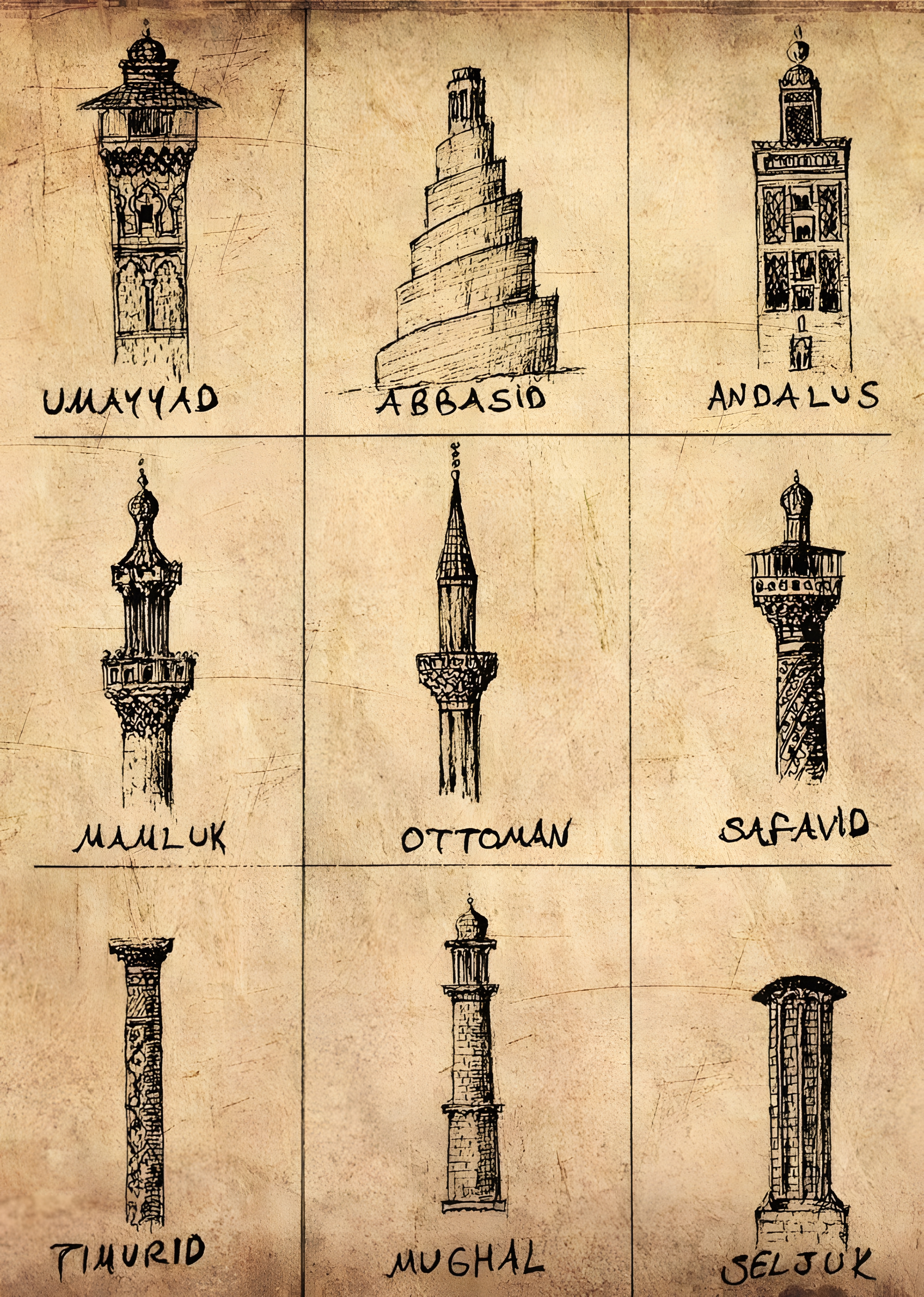문화권별, 시대별 관찰하는 미나렛minaret 유형이다. 물론 저보다 더 복잡할 테지만, 그런 대로 저런 유형이 있다 정도로 이해하면 되겠다.