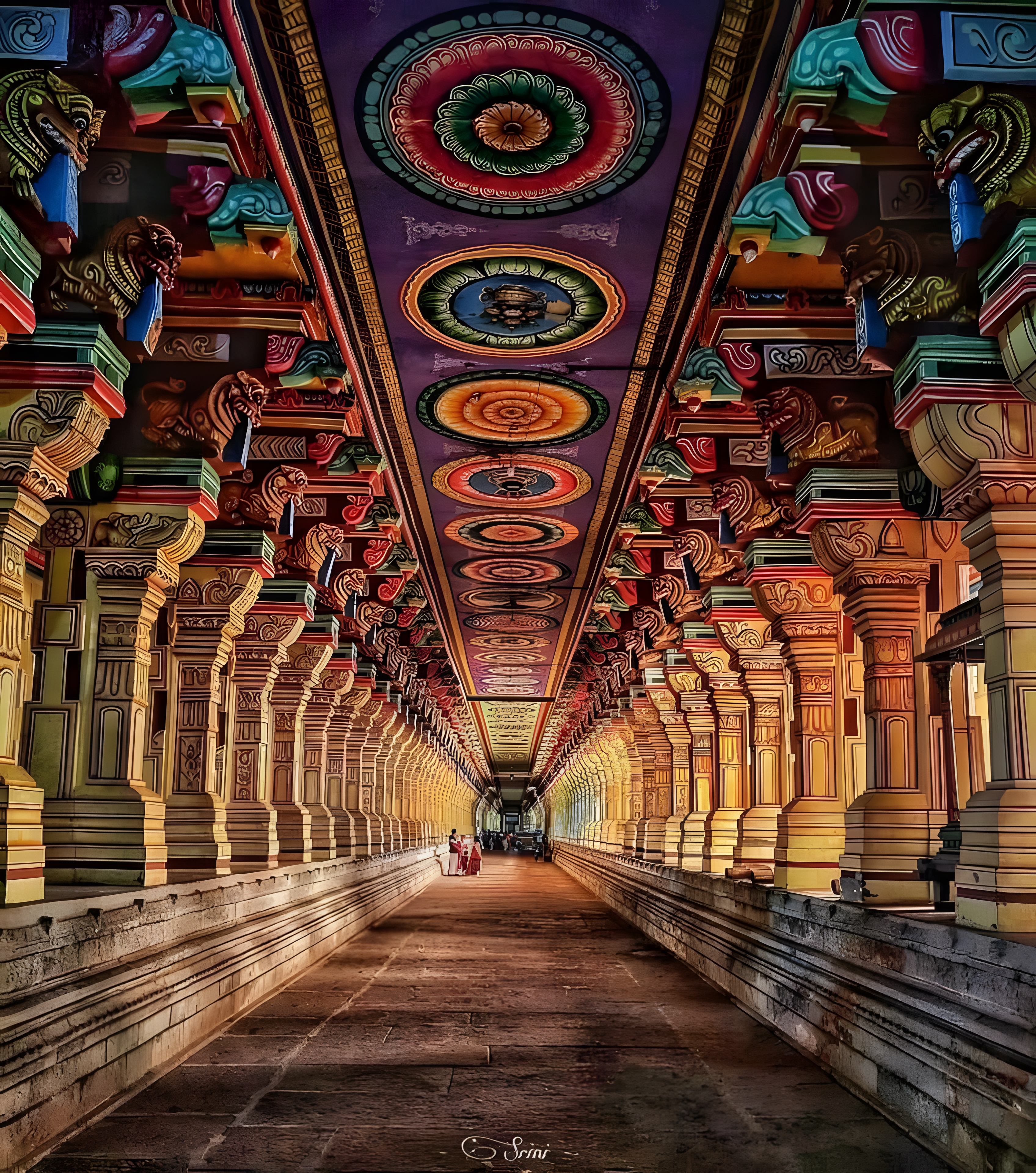 인도 타밀나두 주 라메스와람 섬에 위치하며 힌두신 시바를 봉안한 라마나타스와미 사원 Ramanathaswamy Temple 이란 데를 장식한 저 복도는 길이가 자그마치 1천212m에 달한댄다.