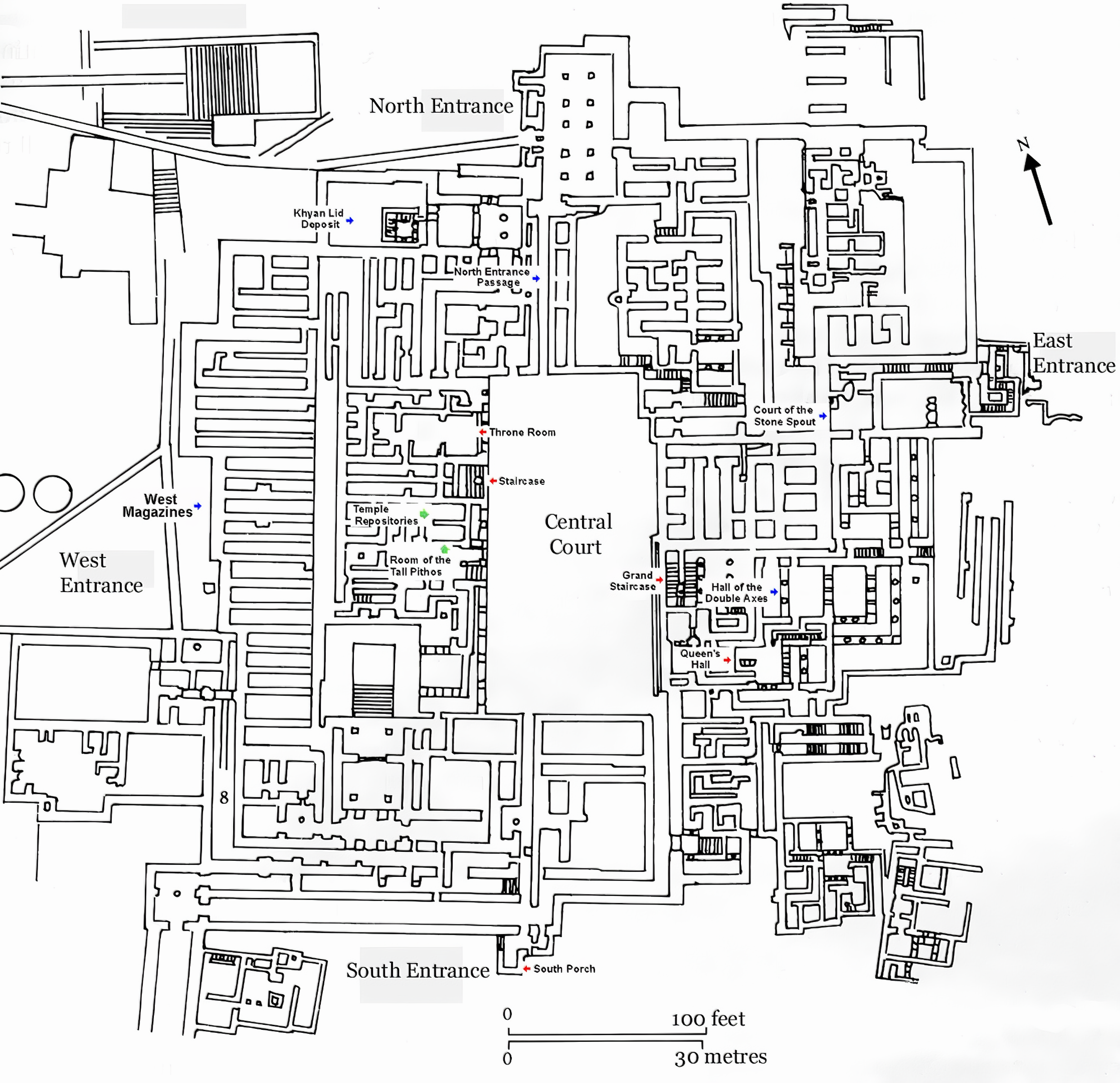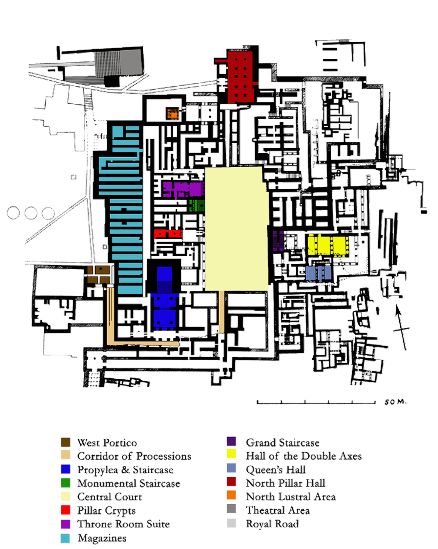 북쪽 출입구North Entrance에서 크노소스 항구로 이어지는 도로가 있다. 북쪽 출입구 옆에는 높은 스토아stoas가 있고, 서쪽에는 불 헌트 프레스코Bull Hunt fresco로 장식되어 있다.