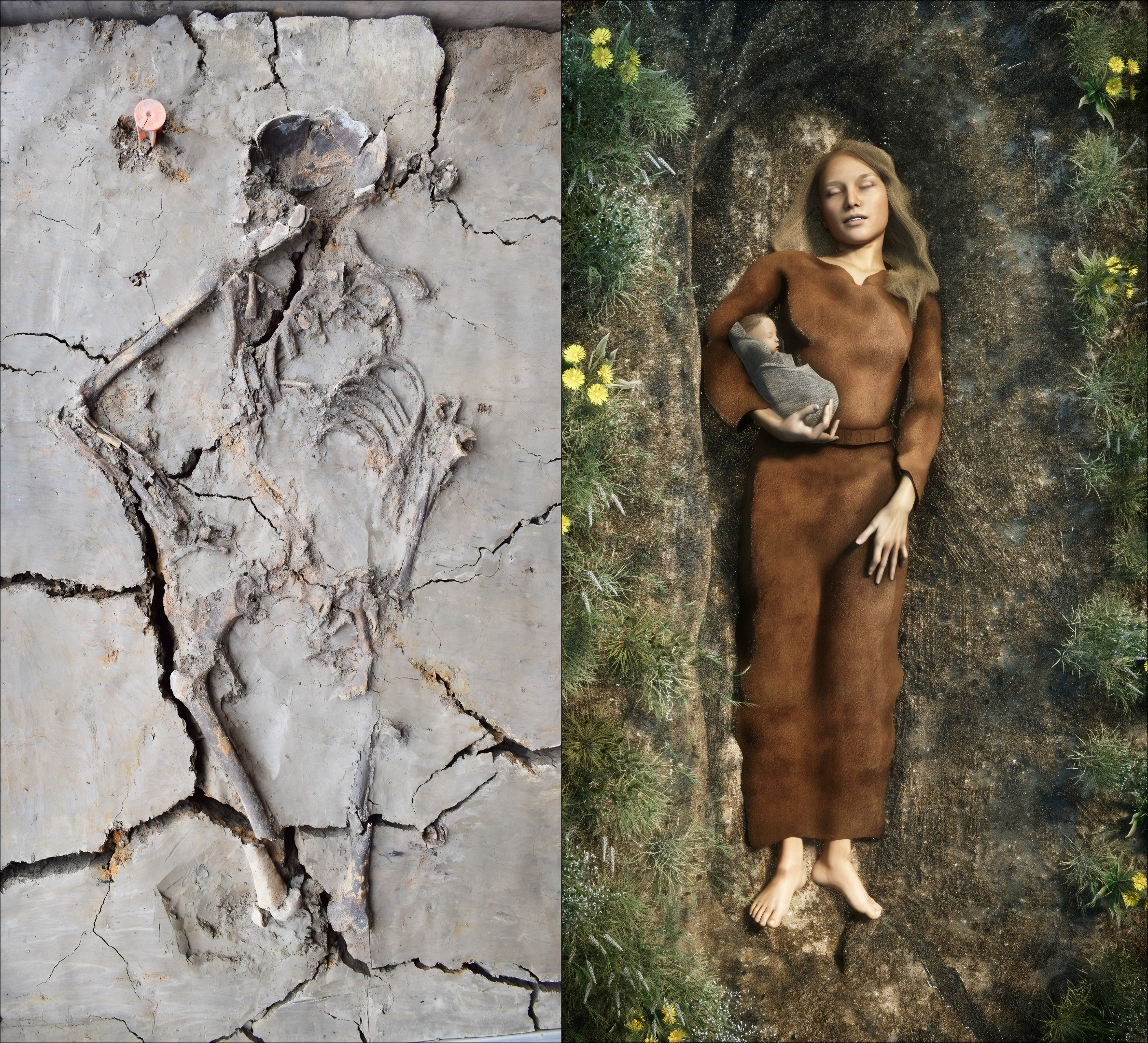 네덜란드 니우에헤인Nieuwegein에서 발굴한 신석기 시대 무덤에서 30세 여성이 팔 안쪽에 아기를 안고 묻혔다.