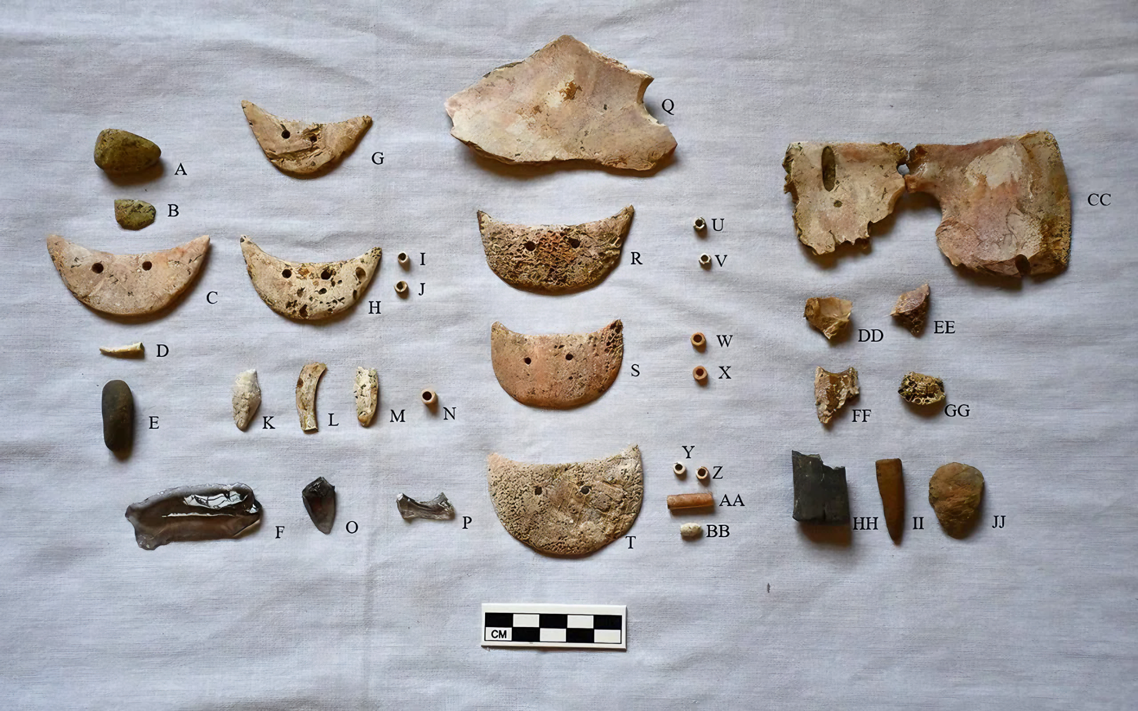 여자는 방주조개 껍질ark clam shells로 눈을 가린 채 묻혔고, 몸에는 초승달 모양 연체동물 장식품Spondylus mollusk ornaments과 흑요석 칼날obsidian blades, 게발톱crab claw을 둘러쌌다.
