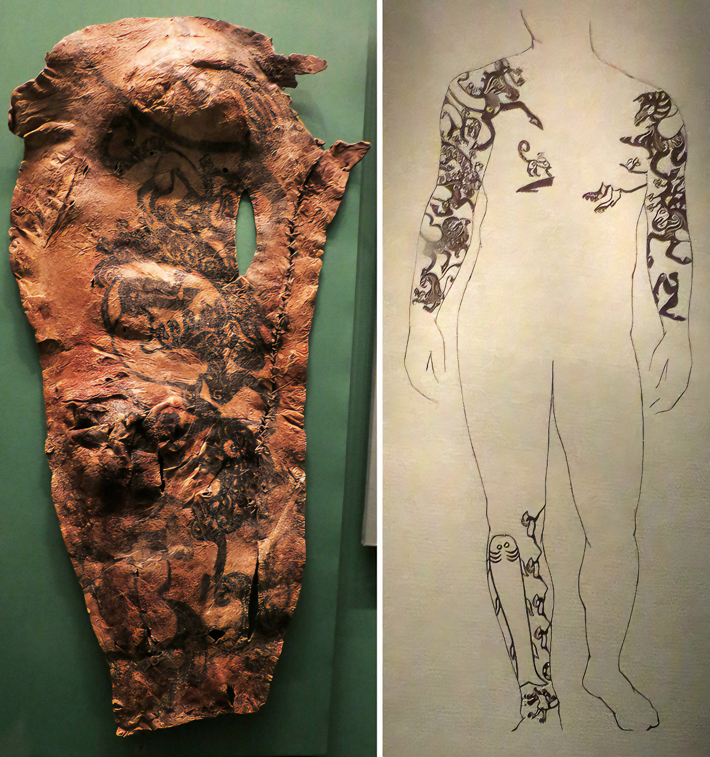 첨부사진 두 장 중 왼쪽은 파지리크 무덤 가죽 부착물로 추정된다 하며 오른쪽은 저네들 태투 양태 중 하나다.