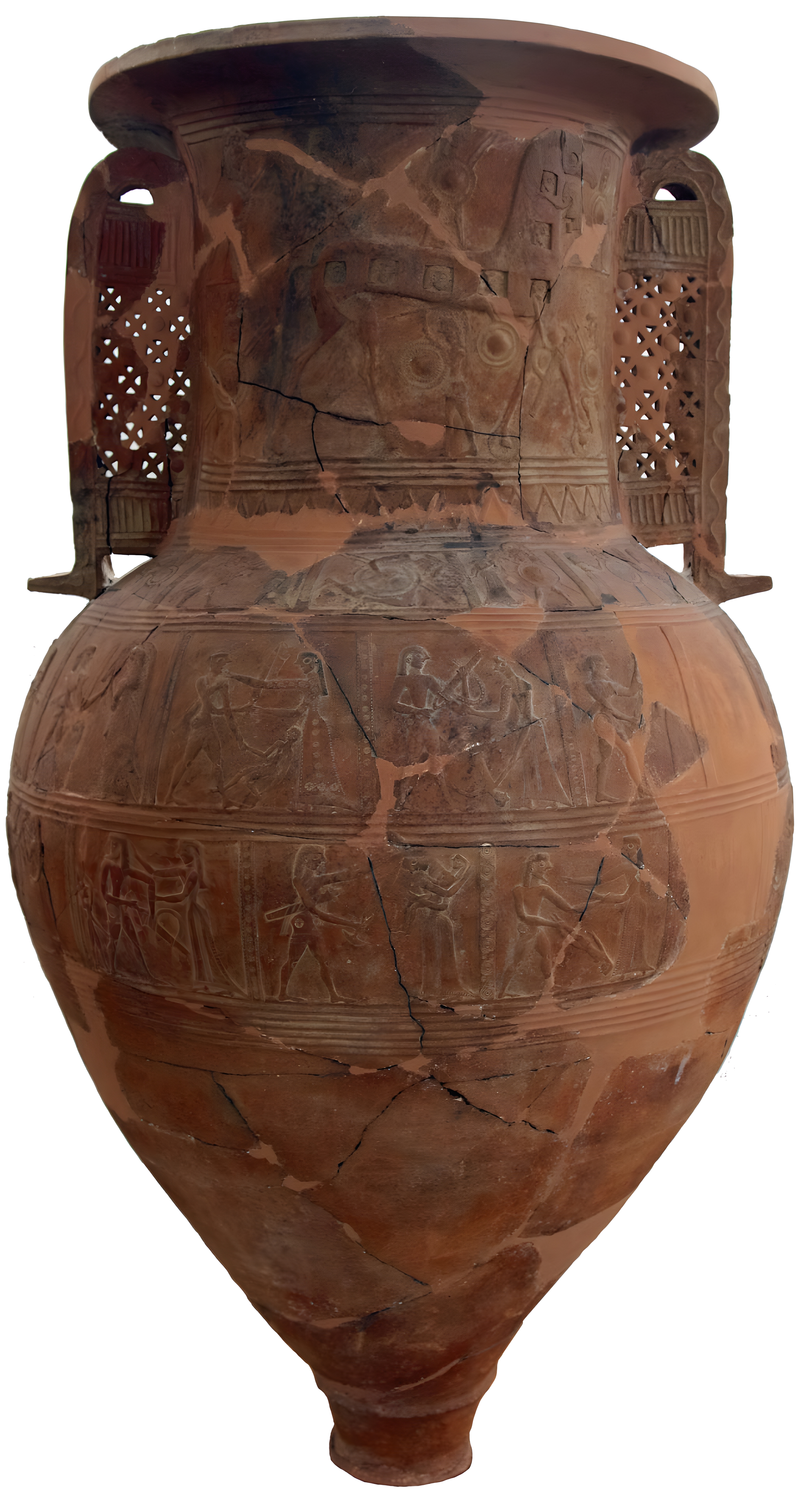 이 미코노스 병 Mykonos vase 은 피토스 pithos 일종으로, 오디세이Odyssey에서 트로이 전쟁 중 트로이 몰락에 대해 호머가 이야기하는 트로이 목마Trojan Horse를 묘사한 최초의 유물 중 하나다.