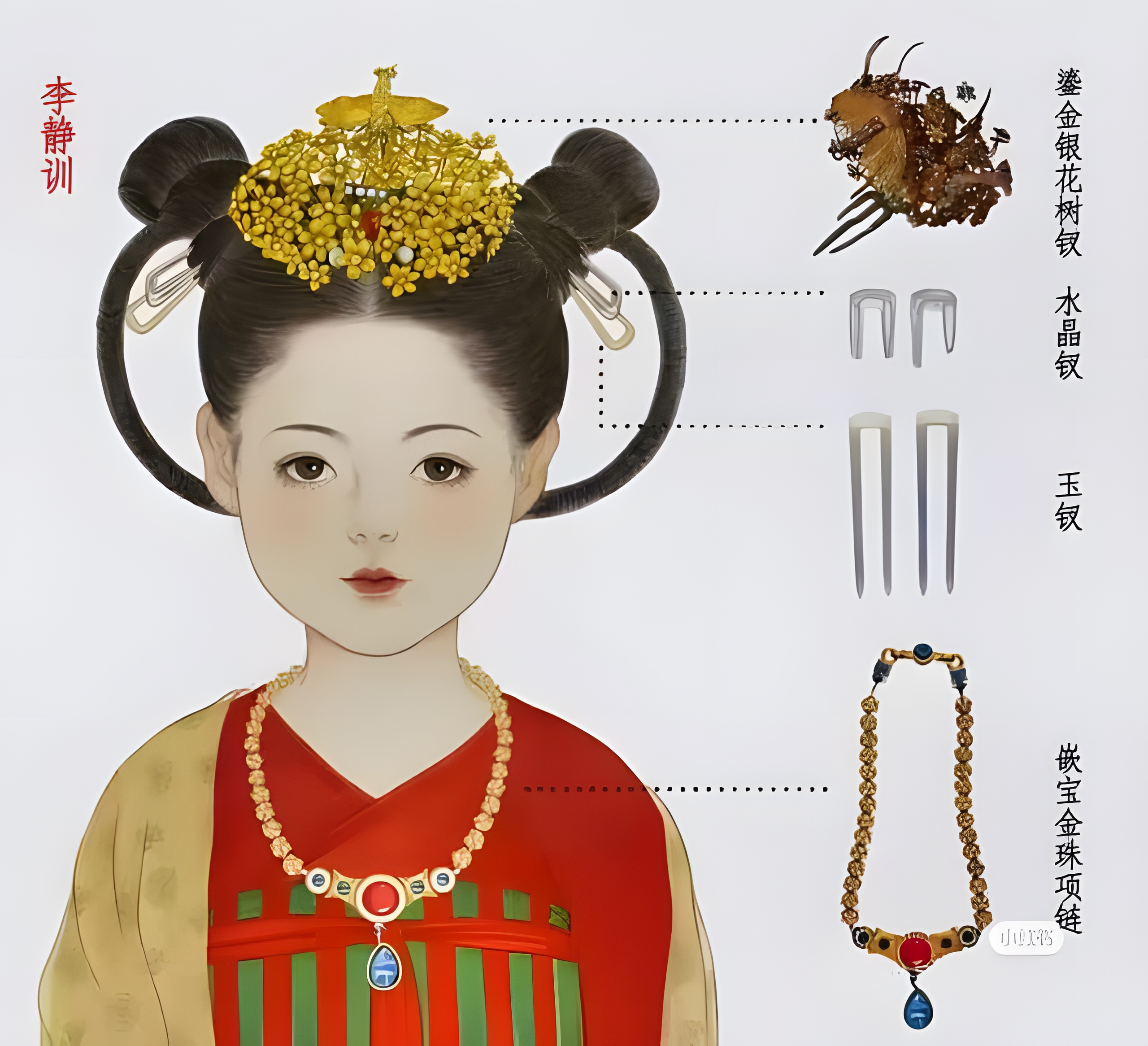 Li Jingxun 李静训(600-608), courtesy name Xiaohai, was born in Chengji, Longxi (now Qin'an County, Gansu Province). He was the great-granddaughter of Li Xian, a great general of the Northern Zhou Dynasty, and the daughter of Li Min, a doctor of the Imperial Household.