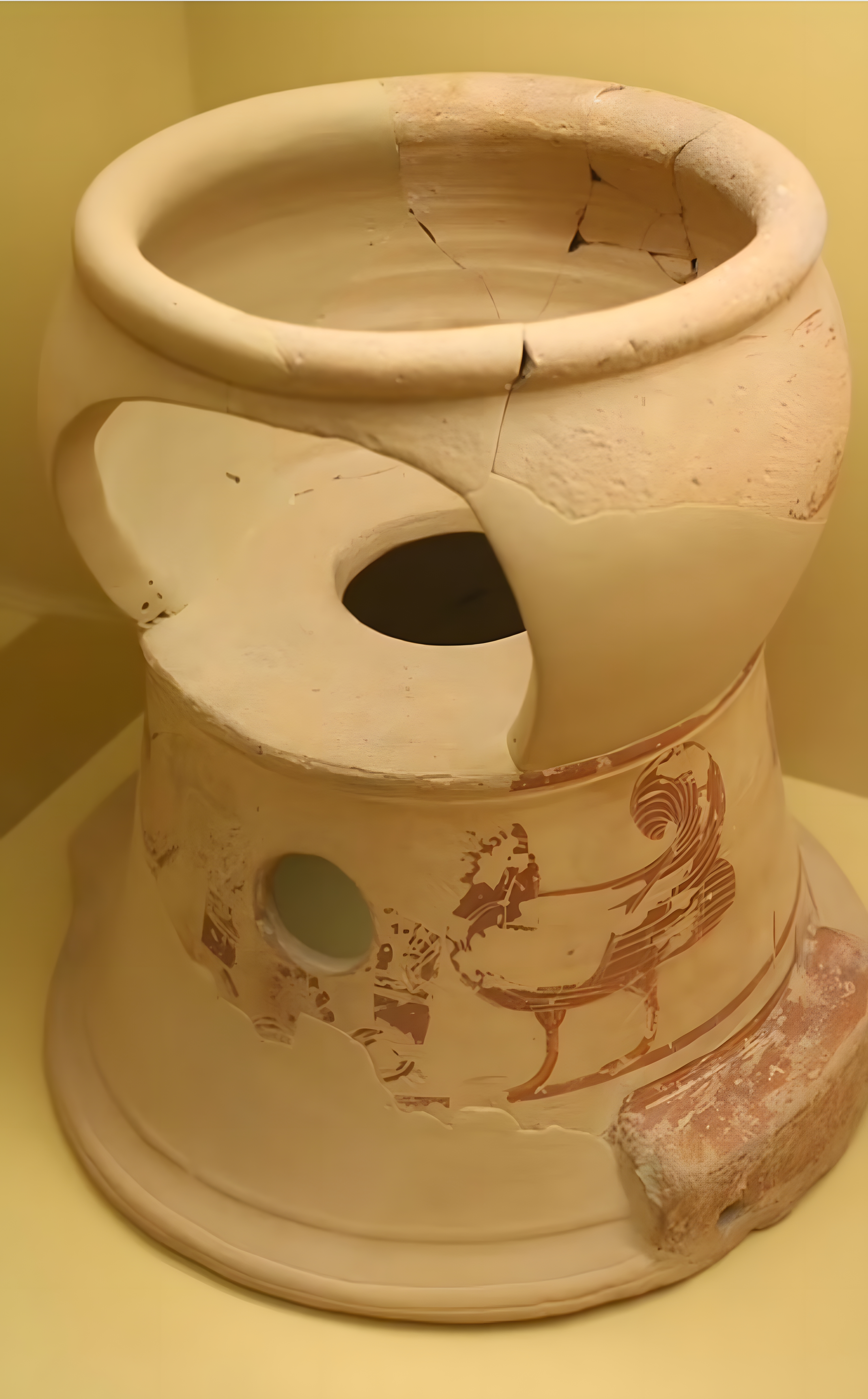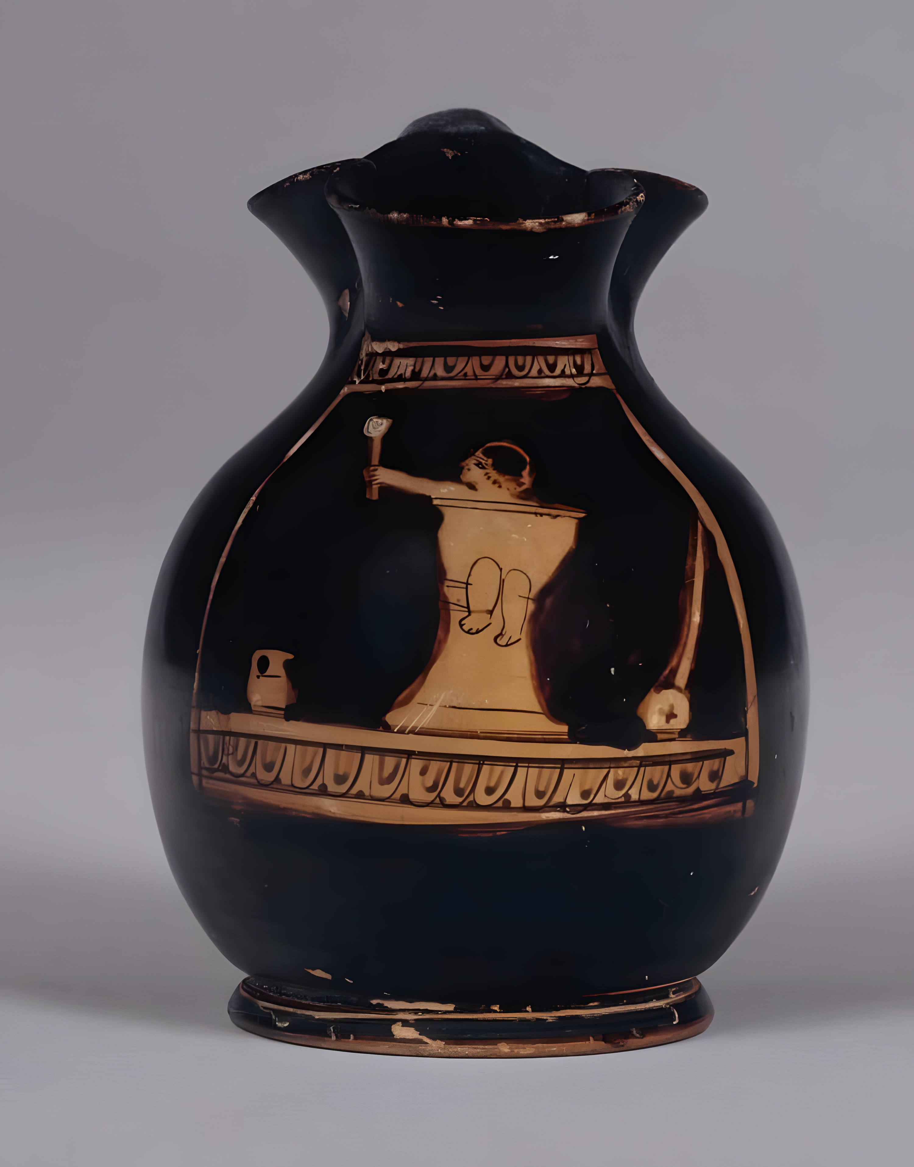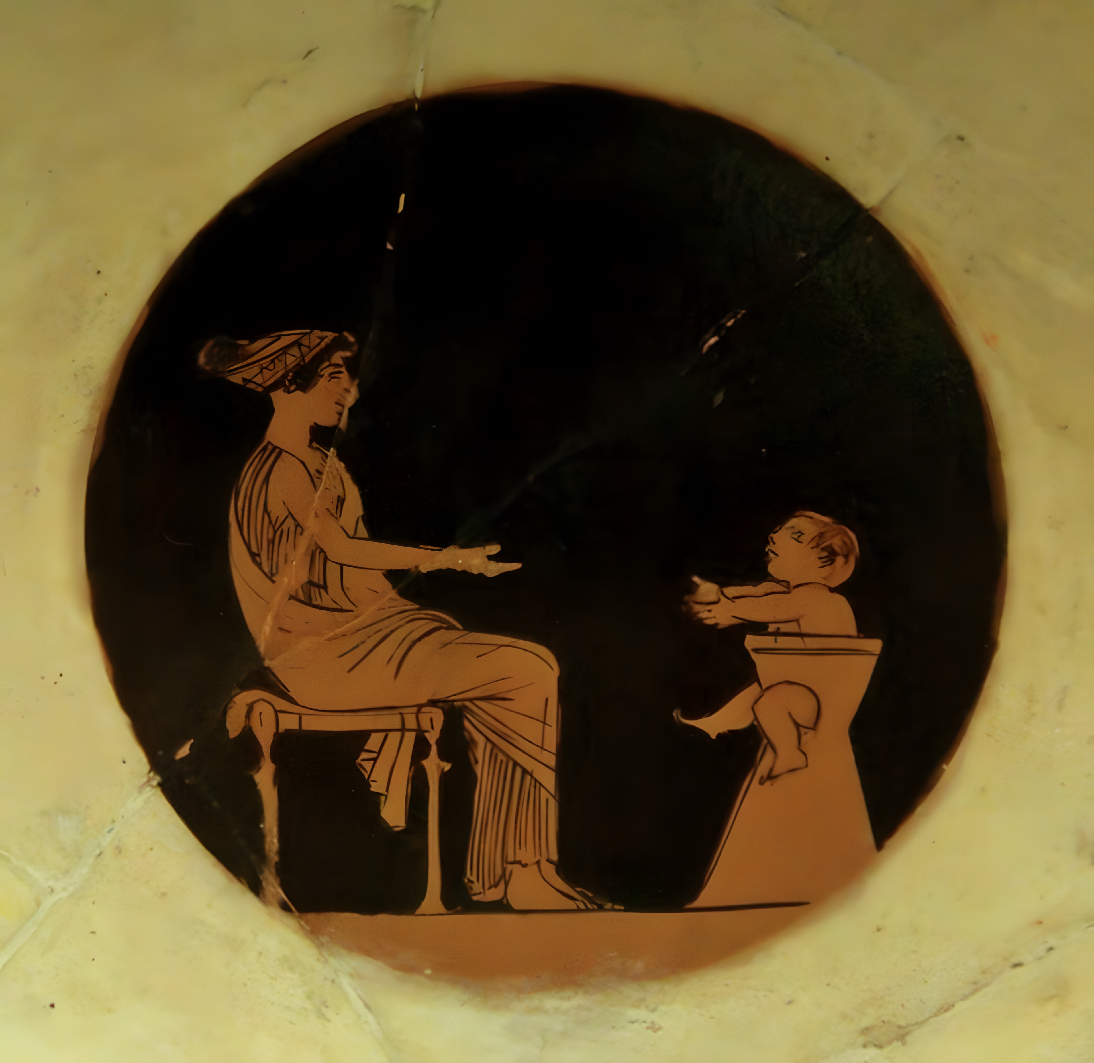같은 맥락을 이루는 그림 소재를 박은 고대 그리스 까무잡잡 도기라 potty 혹은 pottychair라는 변기용 의자에 앉은 얼나를 묘사한다. 기원전 5세기 무렵 그리스 유물이다.