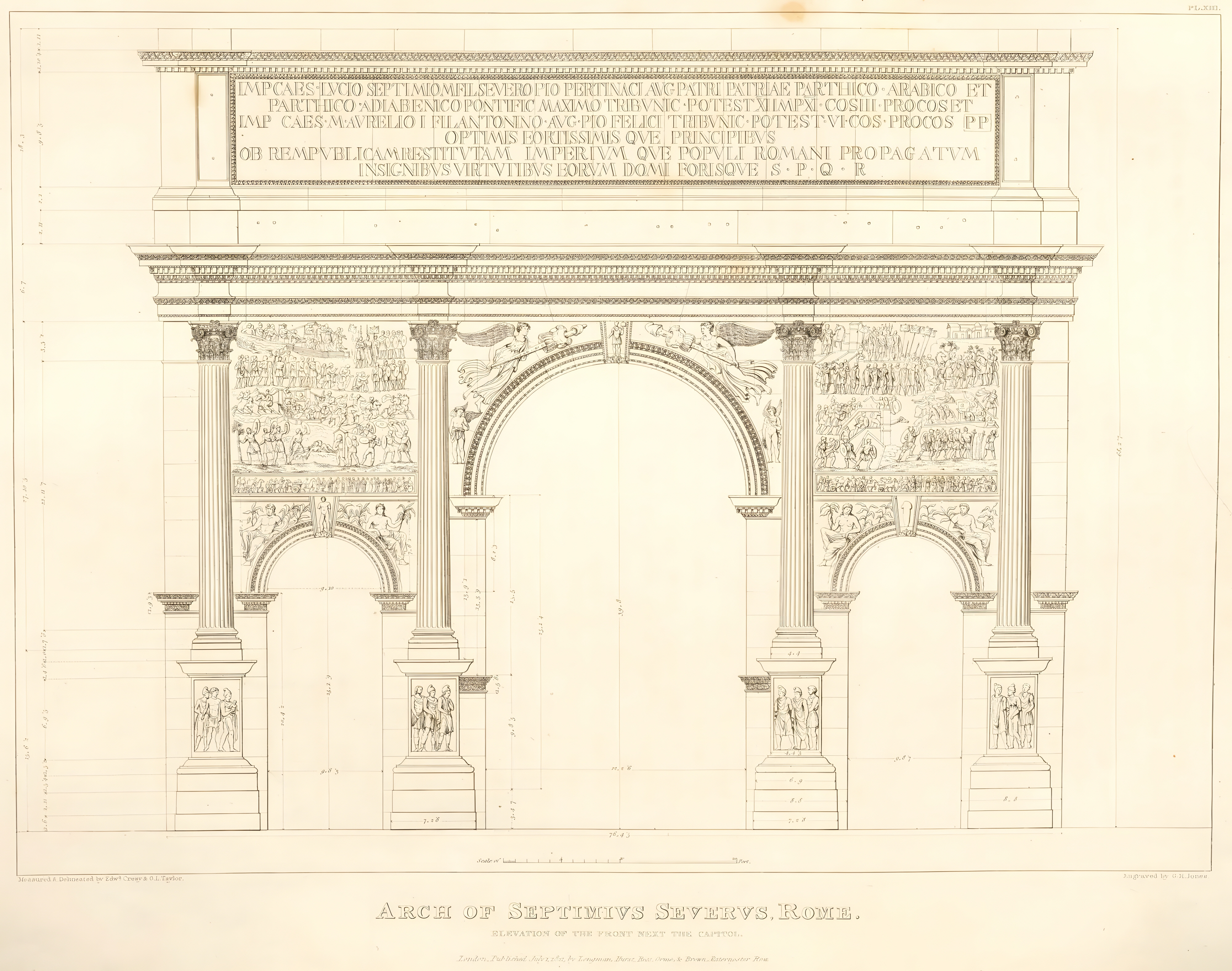 서기 203년에 셉티미우스 세베루스Septimius Severus 황제와 그의 두 아들 카라칼라Caracalla와 게타Geta가 파르티아에 승리한 일을 기념하고자 헌정된 흰색 대리석 개선문이다.
