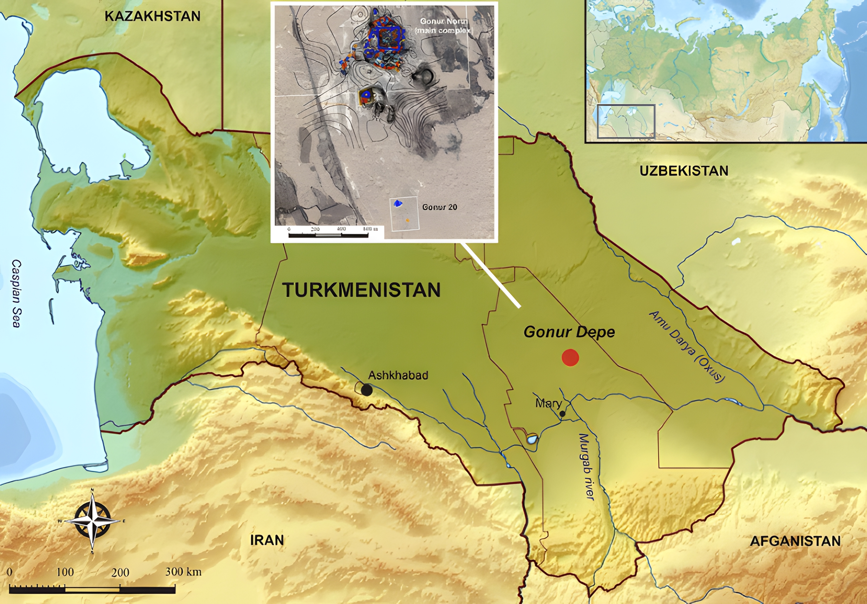 Gonur는 Murghab 강 삼각주 지역에서 가장 큰 유적 중 하나다. 이곳에서는 150개가 넘는 고대 정착지가 발견되었다.