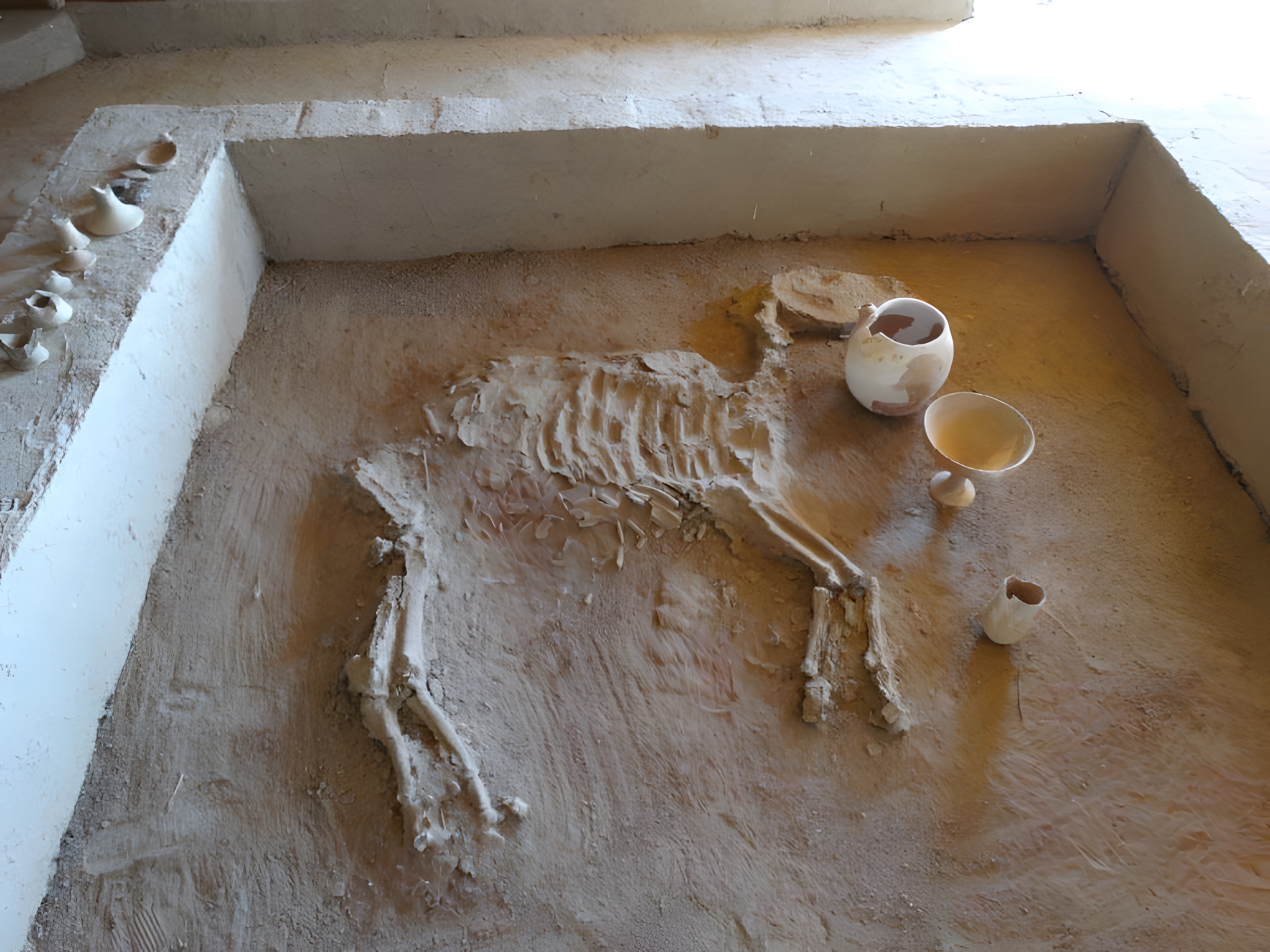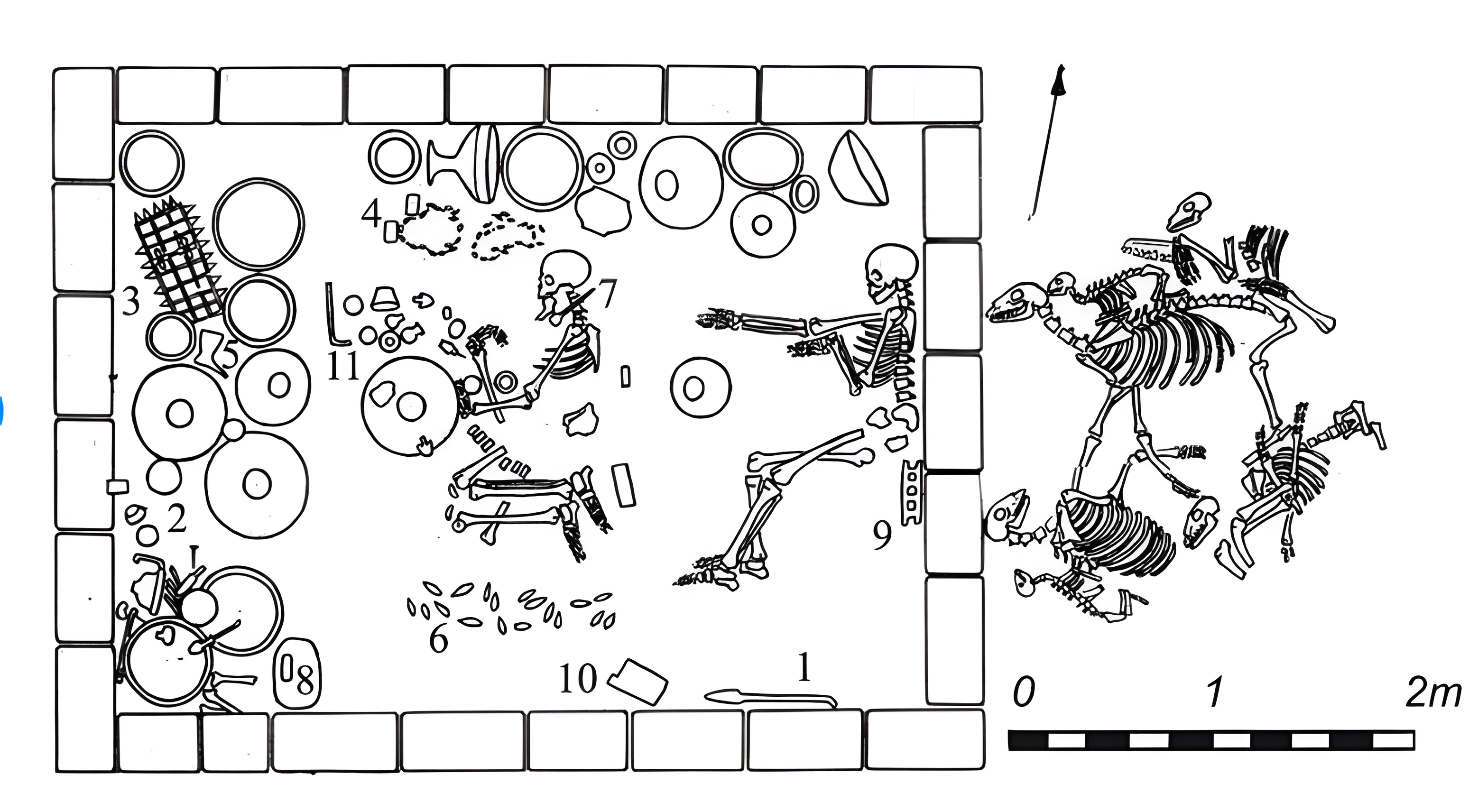 이 묘지 소위 "전사의 무덤 tomb of a warrior "(2380번)에서는 청동으로 만든 철퇴mace 머리와 눈에 띄는 귀를 가진 말 한 마리 개체분 뼈가 발견되었다.