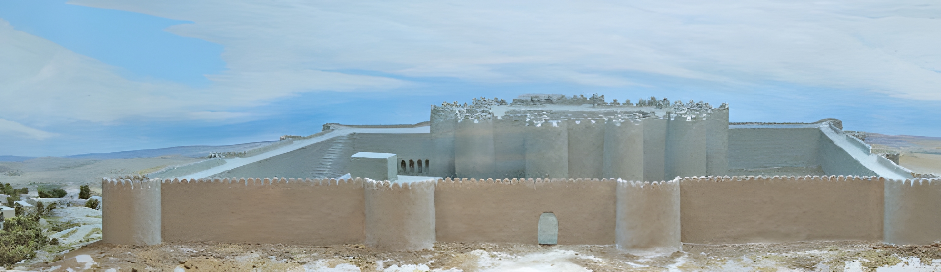 기념비 궁전은 중앙에 있었고(약 150 x 140m) 이중 벽으로 둘러쌌고 두 개 큰 안뜰과 축형 복도 axial corridor(무슨 말?), 제품을 위한 대규모 매장지 및 내부 주거 공간이 특징이다.
