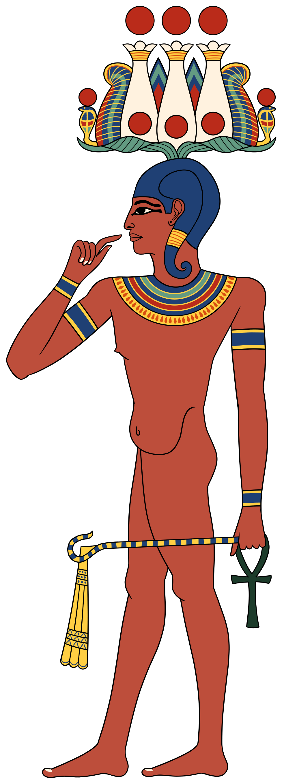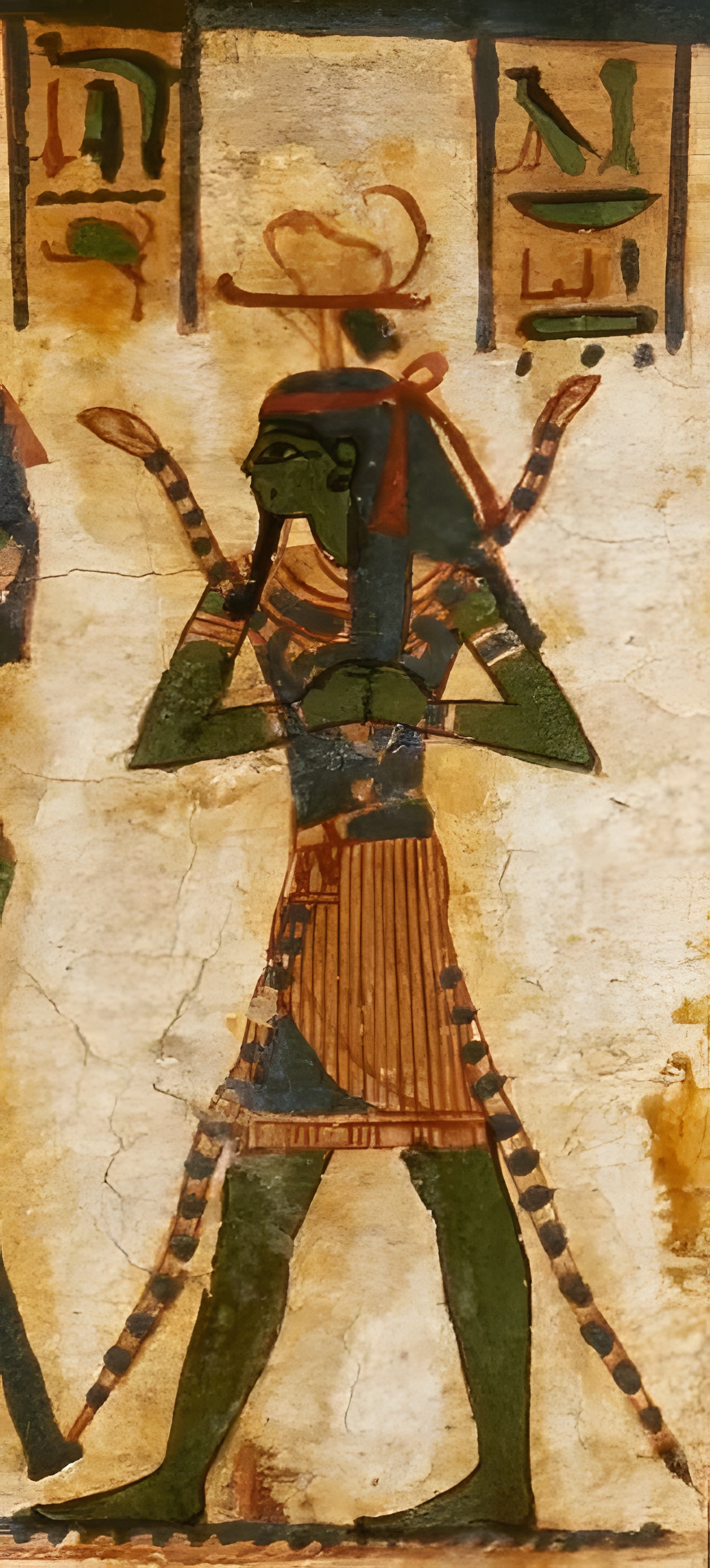 그의 이름(그리고 주술이라는 단어)은 꼬인 아마flax와 한 쌍의 팔을 든 모습으로 묘사되었다.
