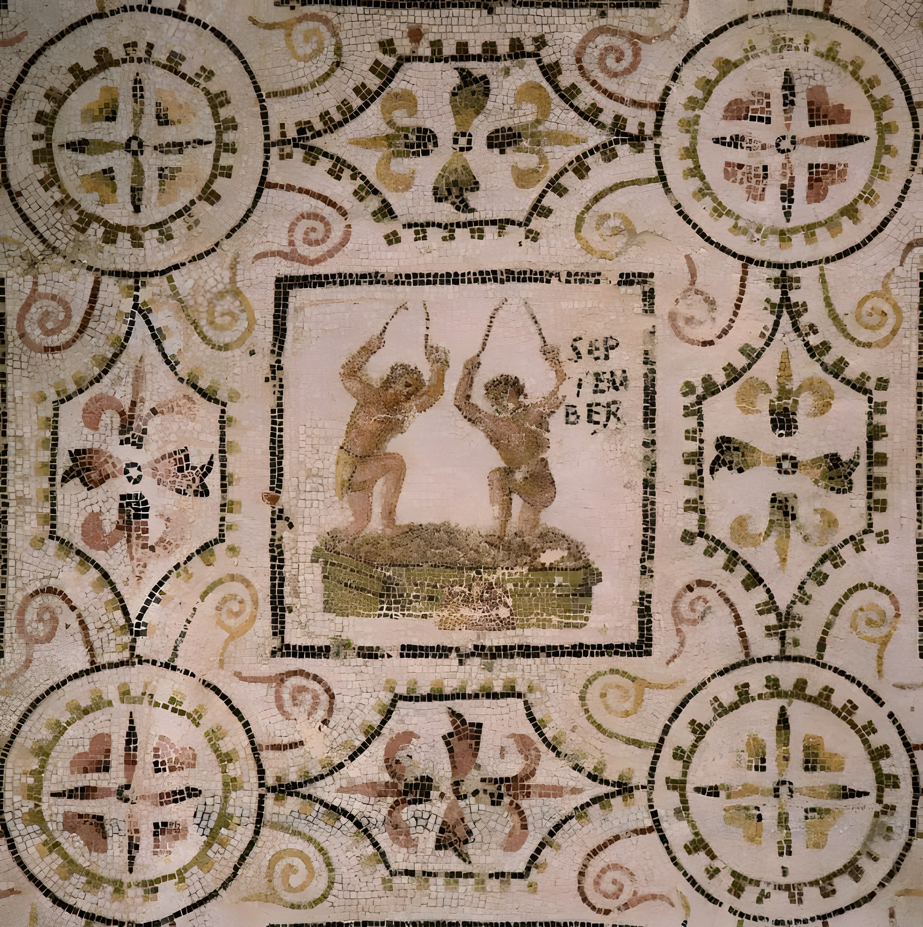 저 앞 사진 모아지크는 튀니지 엘 젬El Djem에서 출토한 서기 3세기 유물로 튀니지 수스 고고학 박물관Sousse Archaeological Museum에 있다.