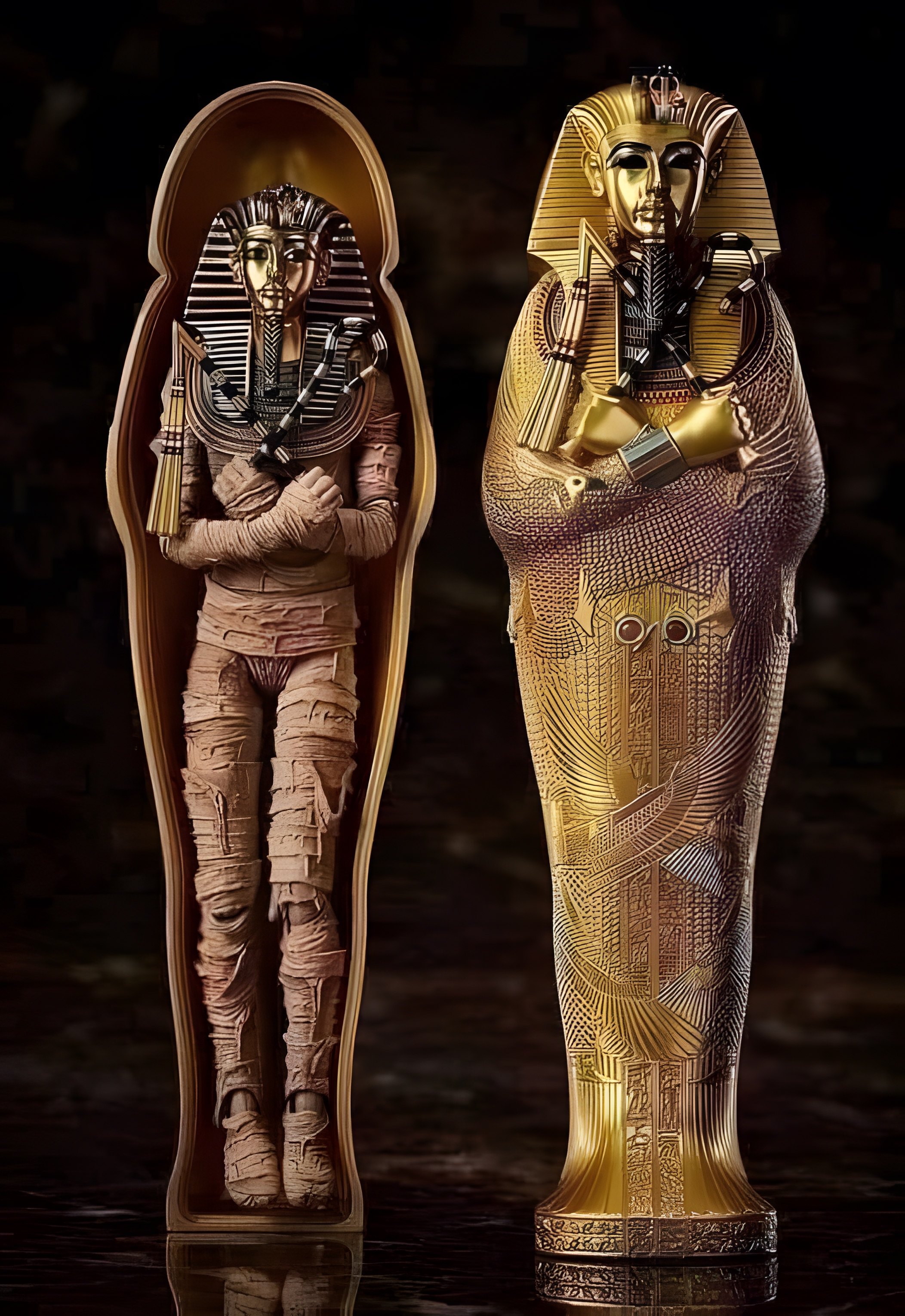 황금관에는 리넨으로 조심스럽게 싸고 다양한 부적과 보석으로 장식한 투탕카멘 미라가 있다.